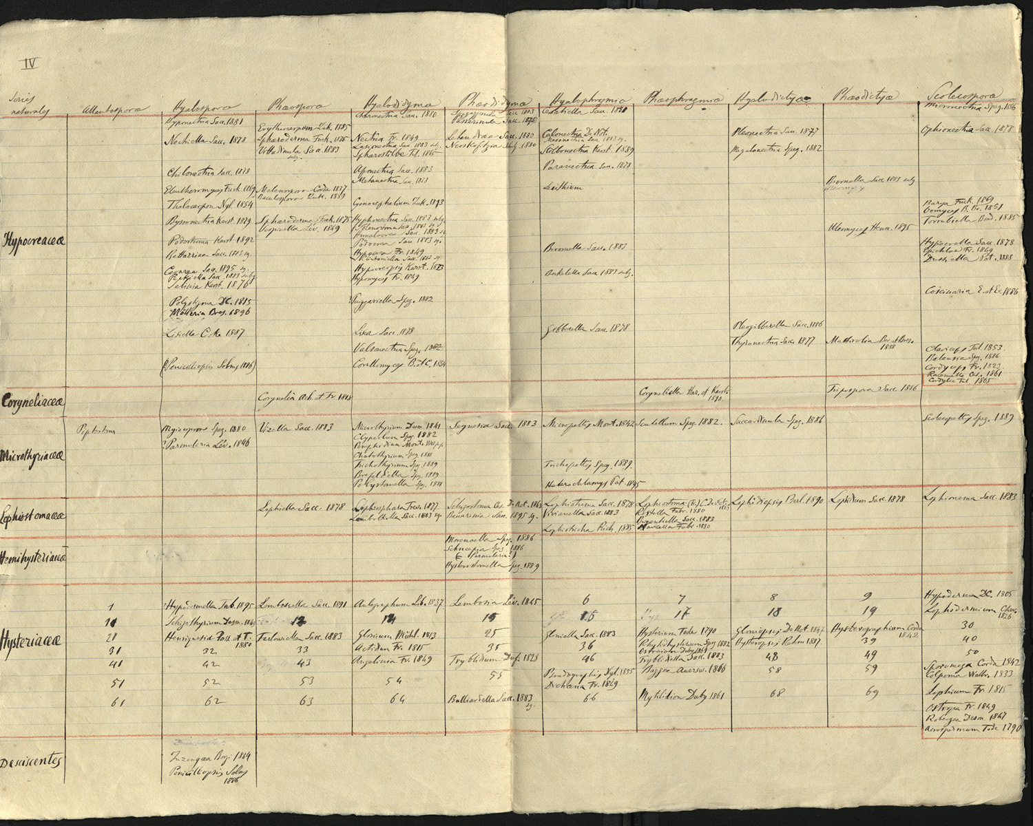 Lista di famiglie e generi fungini: Hypocreaceae, Coryneliaceae, Microthyriaceae, Lophiostomaceae, Hemihysteriaceae, Hysteriaceae, Desciscentes.