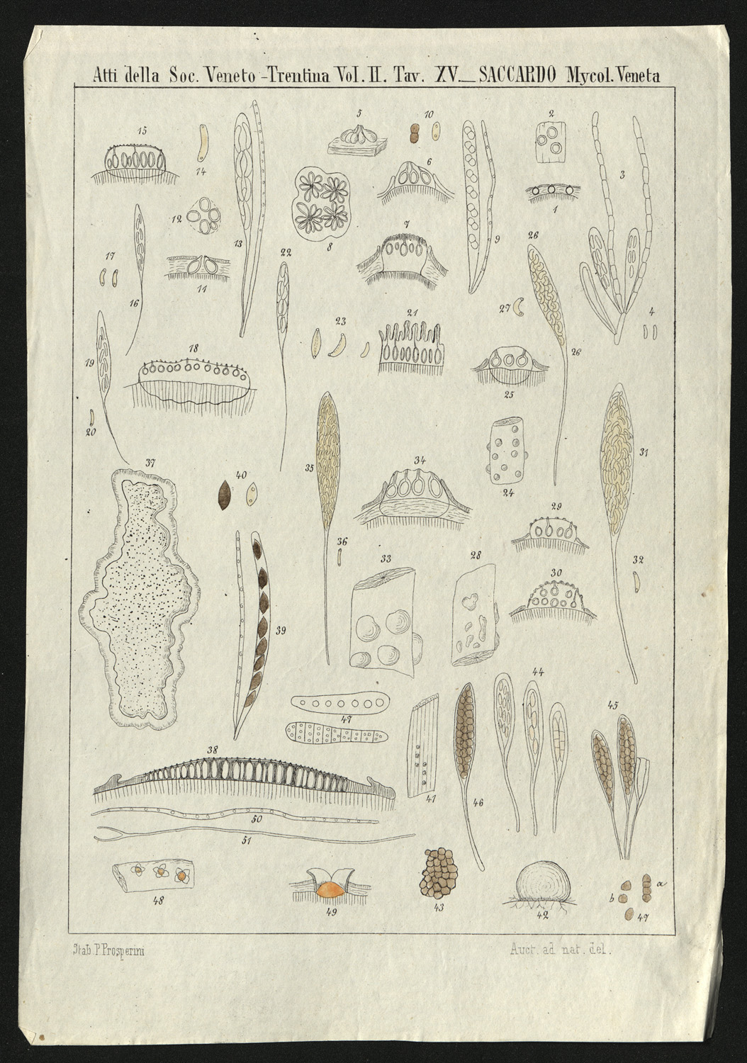 Contiene n. 44 tavole, o parti di tavole, con disegni a volte colorati ed alcuni portano l'intestazione del secondo volume degli Atti della Soc.Veneto-Trentina. Vi sono anche due pagine di lista e due del "systema carpologicum".