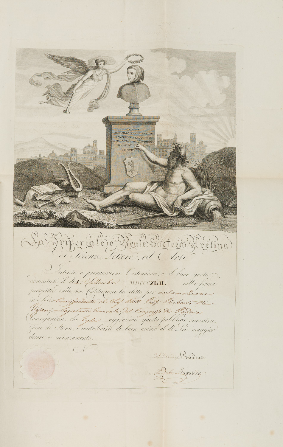 Diploma con il quale si conferisce il titolo di Socio Corrispondente dell'Imperiale e Reale Società Aretina di Scienze, Lettere ed Arti a Roberto De Visiani. Il titolo è stato elargito nella seduta del 1 settembre 1842.
