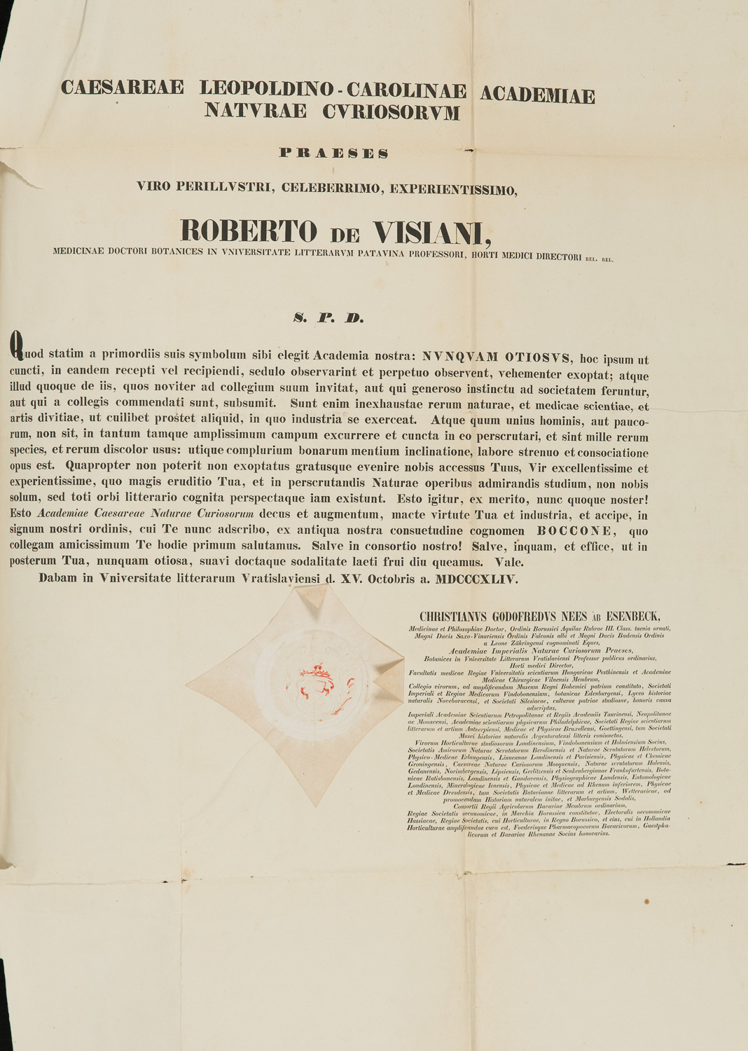 Diploma con il quale si conferisce a Roberto De Visiani la nomina a Membro dell'Accademia Caesareo Leopoldina Carolina Naturae Curiosorum di Breslavia, in data 15 ottobre 1844.