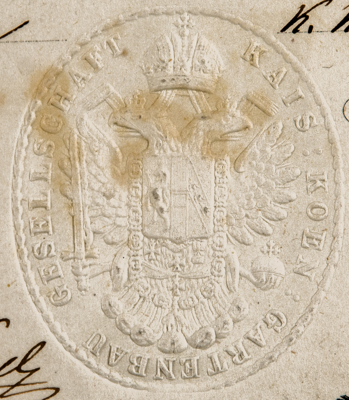 Dettaglio del timbro presente sul diploma con il quale si conferisce la medaglia d'oro societaria della Kaiserliche Königliche Gartenbau-Gesellschaft in Wien a Roberto De Visiani per il frutto della Vaniglia presentato alla 13° Esposizione locale della società.