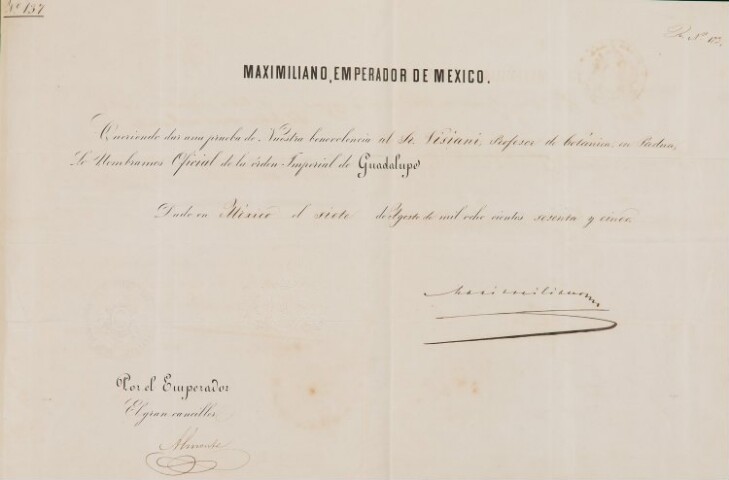 Diploma con il quale si conferisce il titolo di Oficial de la Imperial Orden de Guadalupe a Roberto De Visiani.