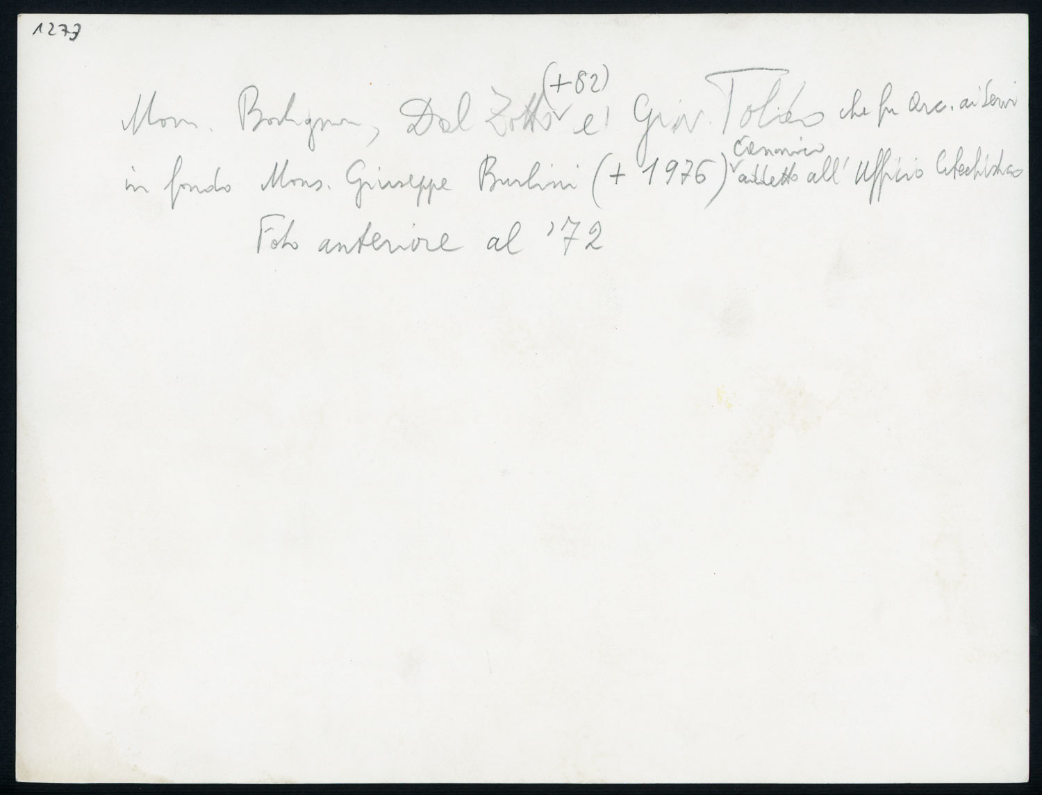 Nota manoscritta sul retro della foto: Mons. Bortignon, Dal Zotto (+82) e Giov Toldo che fu arc. ai Servi. In fondo mons. Giuseppe Burlini (+1976) canonico addetto all'Ufficio Catechistico. Foto anteriore al 1972.