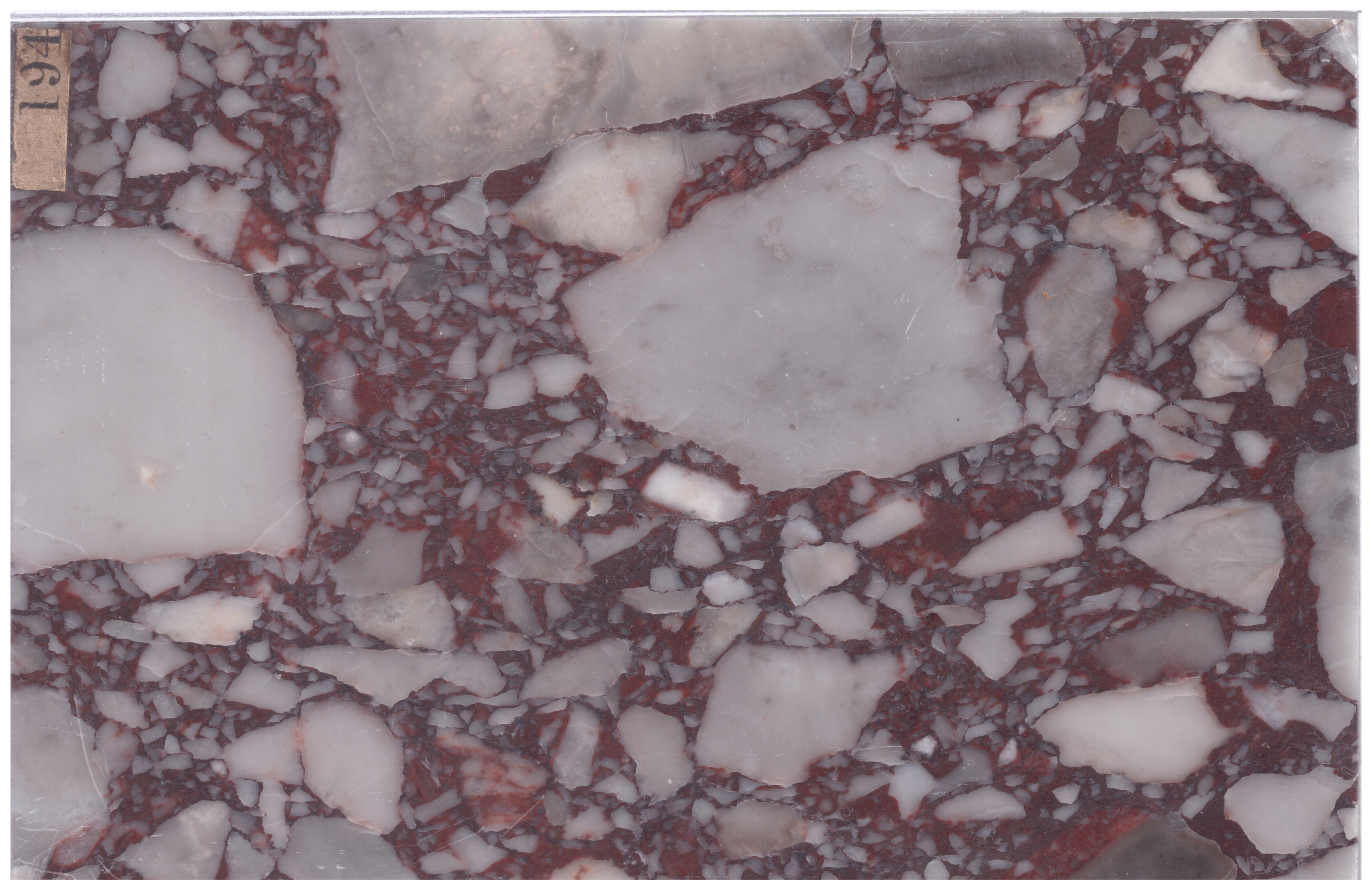 Breccia appartenente alla collezione delle pietre ornamentali “Sarti” impiegate nell’edilizia del Mondo Antico e del Rinascimento fino al 1876, anno della donazione alla Collezione di Mineralogia “Museo Luigi Bombicci” dell’Università di Bologna da parte dell’architetto Antonio Sarti.