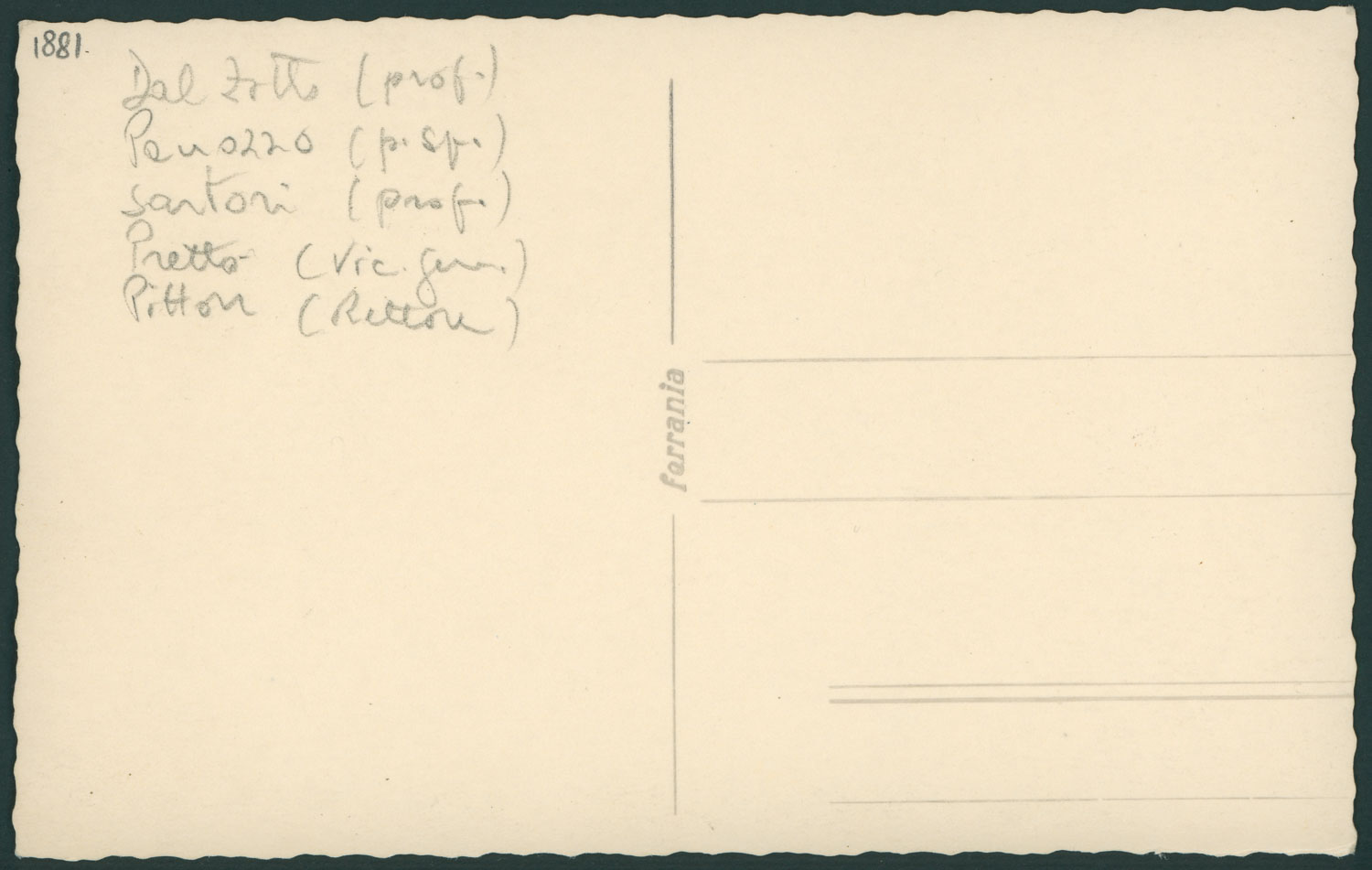 Nel retro della foto sono riportati i nomi dei sacerdoti: Dal Zotto, Panozzo, Sartori, Pretto, Pitton.