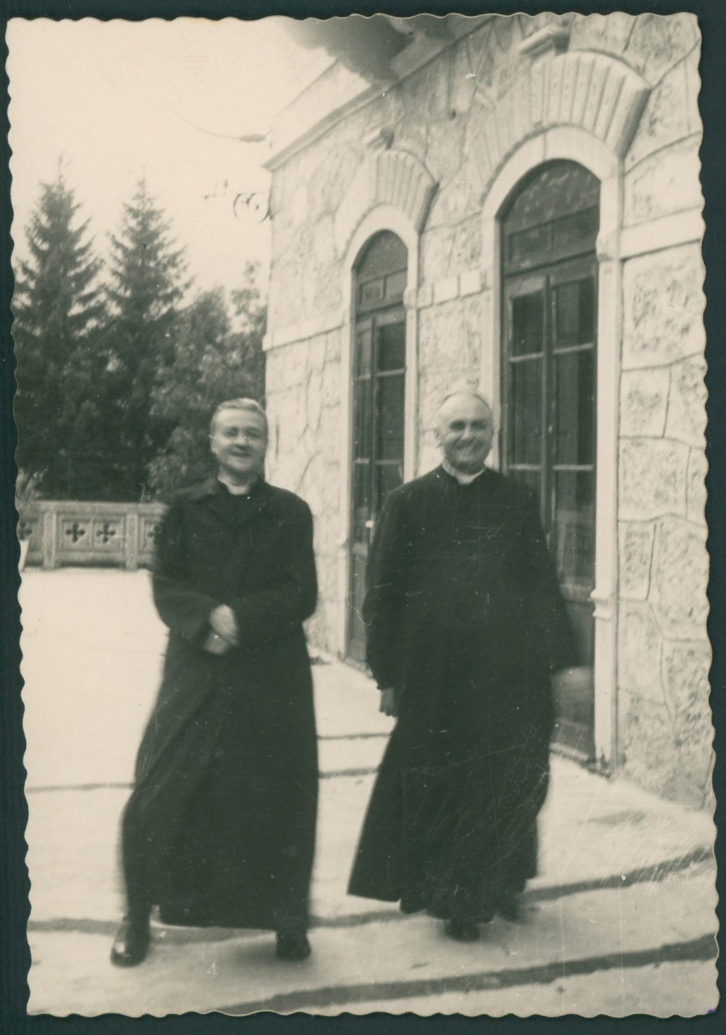 Mons. Pitton, rettore del Seminario e mons. Panozzo, padre spirituale, a Borca di Cadore, Istituto Dolomiti Pio X. 29 agosto 1955