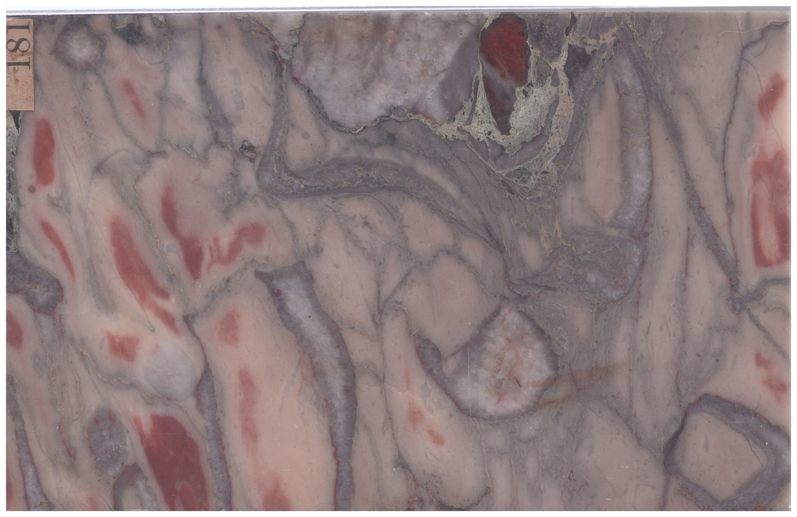Marmo africano appartenente alla collezione delle pietre ornamentali “Sarti” impiegate nell’edilizia del Mondo Antico e del Rinascimento fino al 1876, anno della donazione alla Collezione di Mineralogia “Museo Luigi Bombicci” dell’Università di Bologna da parte dell’architetto Antonio Sarti.