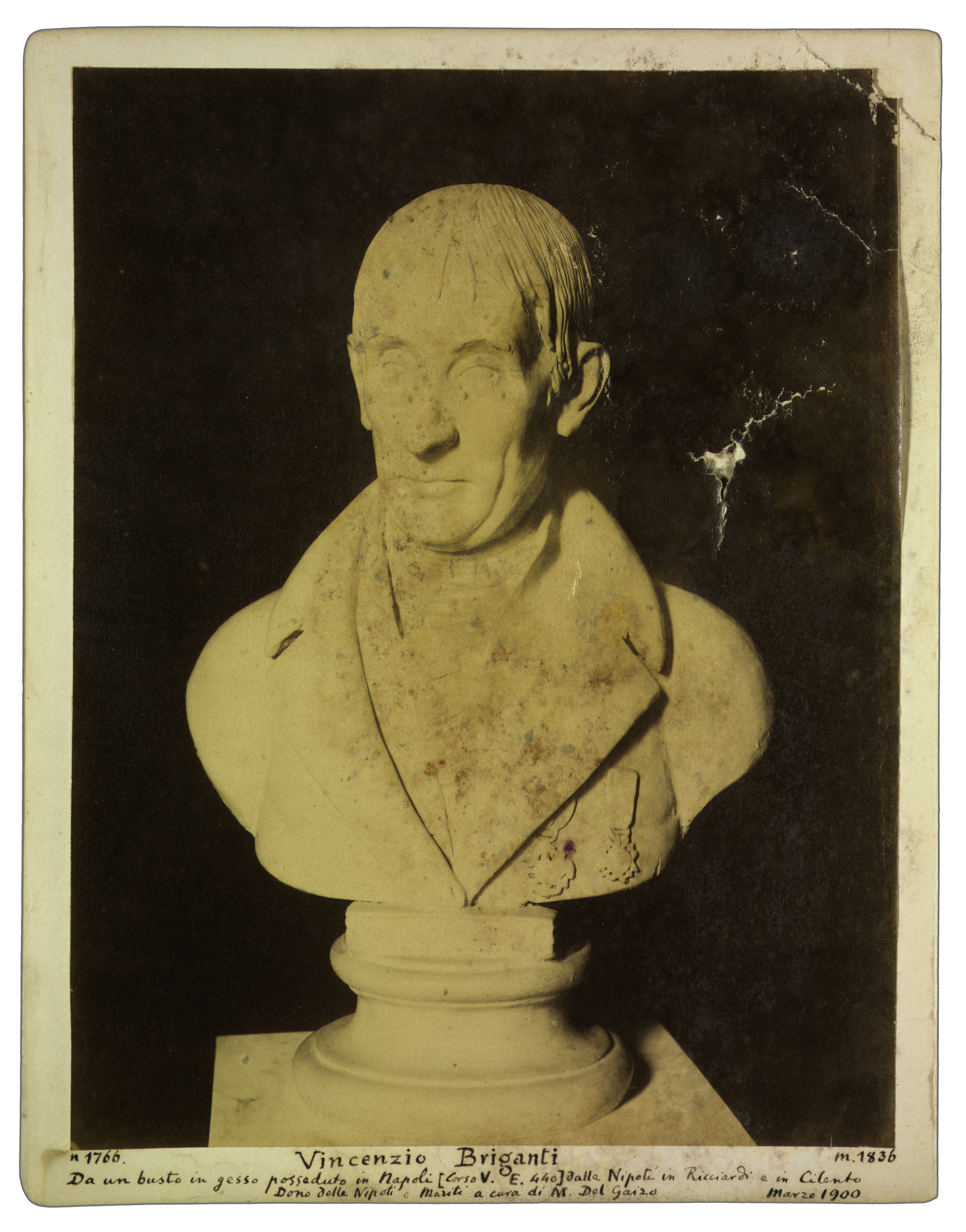 Titolo manoscritto sul recto, dove compaiono gli estremi cronologici e le note: Da un busto in gesso posseduto in Napoli (Corso V. E. 440) dalle Nipoti in Ricciardi e in Cilento; Dono delle Nipoti e Mariti a cura di M. Del Gaizo Marzo 1900.