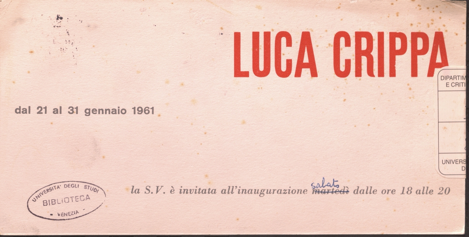 Invito all'inaugurazione della mostra del pittore Luca Crippa (1922-2002), tenuta presso la Galleria del disegno di Milano, dal 21 al 31 gennaio 1961, indirizzato al Prof. Carlo Dalla Zorza.