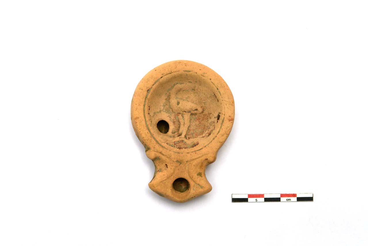Lucerna con serbatoio circolare troncoconico rovescio, con becco triangolare affiancato da volute; disco, circondato da un solco, che tende ad incurvarsi fortemente verso il centro. Su di esso in rilievo c'è un uccello, probabilmente uno struzzo, con la testa irriconoscibile a causa della corrosione. La base è circondata da un solco. Corpo ceramico molto poroso di colore rosa con tracce di vernice bruna.