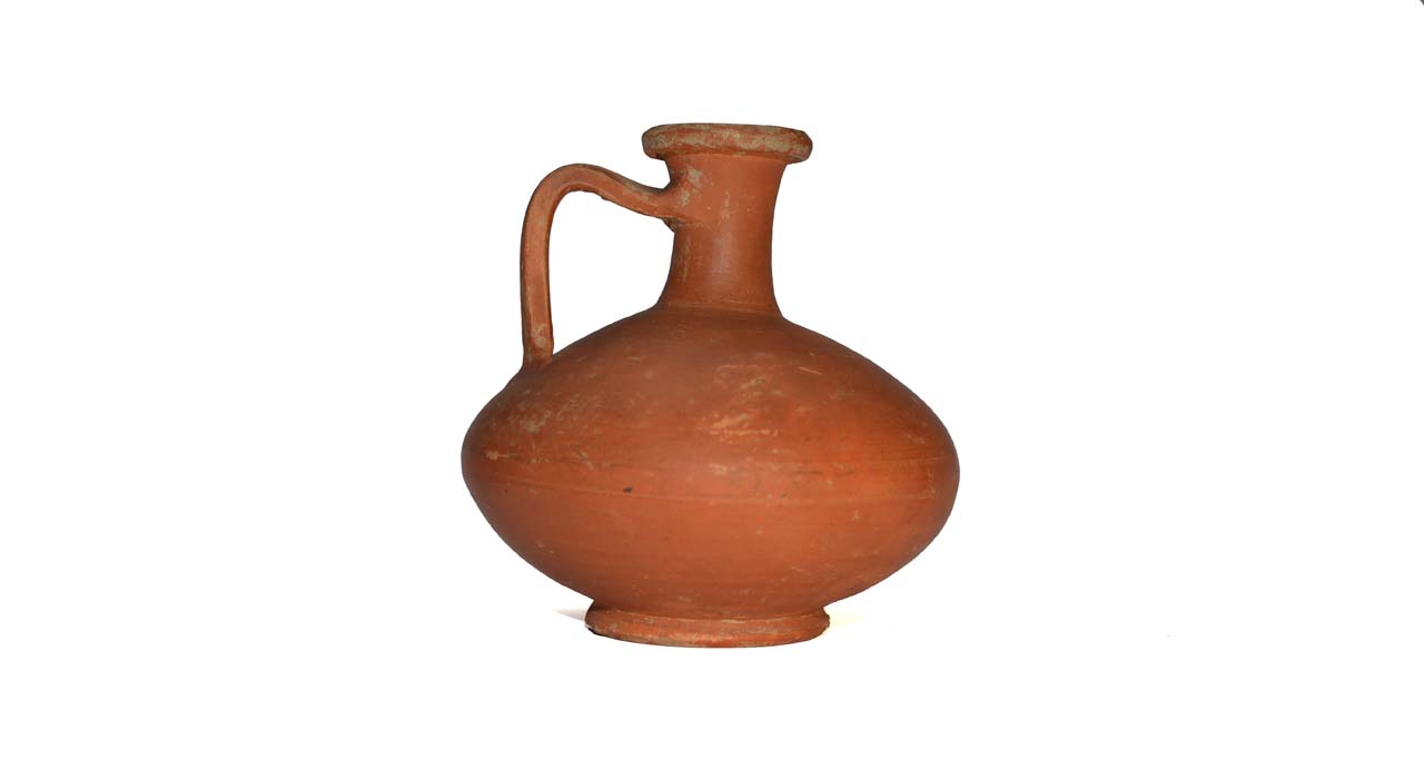 Olpe con ansa a nastro in terra sigillata di produzione nord-italica . Superficie esterna con vernice opaca, scrostata in alcuni punti. Sul fondo una "N" indica la pertinenza alla collezione Neumann.