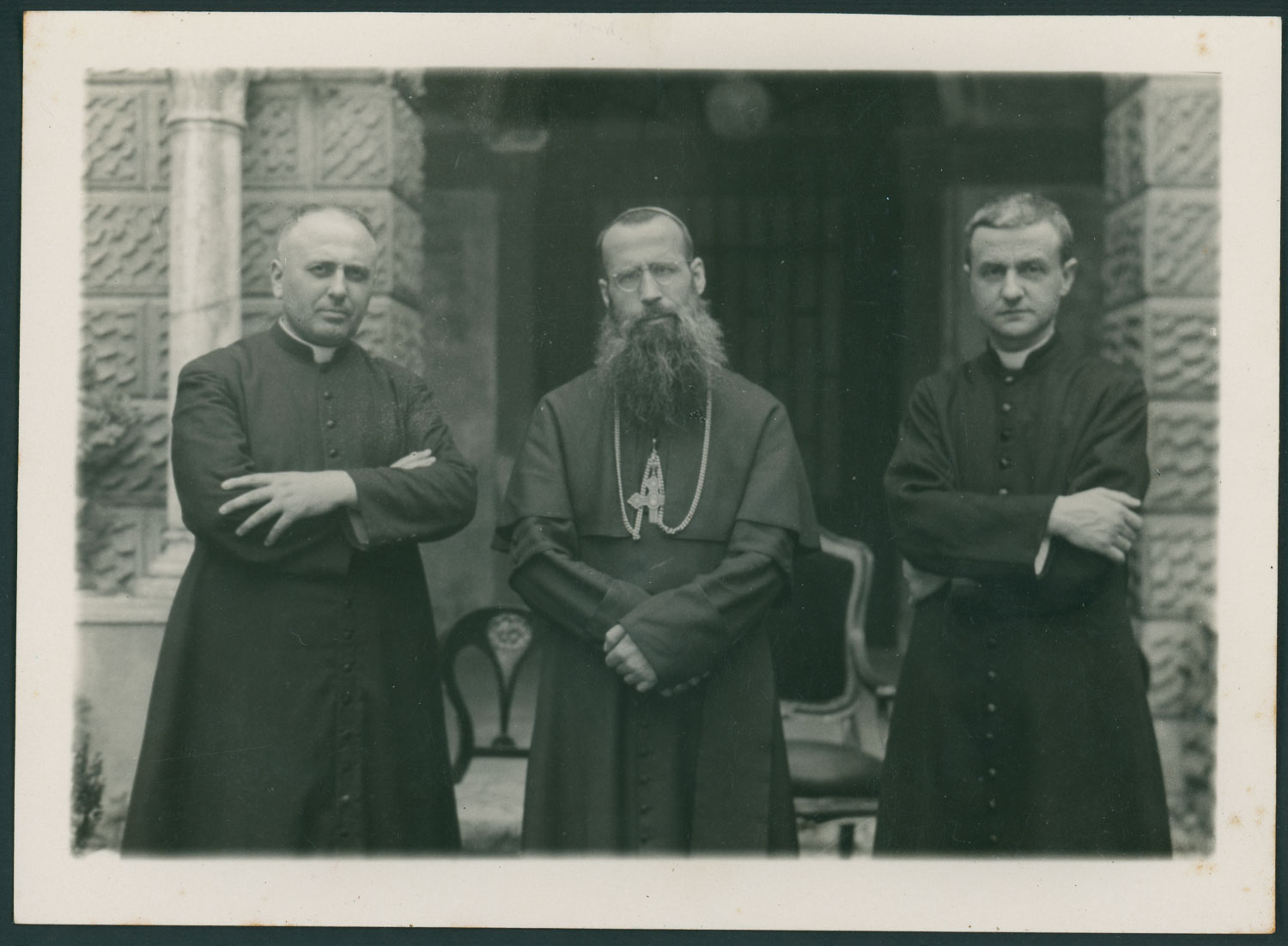 Il vescovo Bortignon con il rettore Pitton e il padre spirituale Panozzo nel chiostro del Seminario.