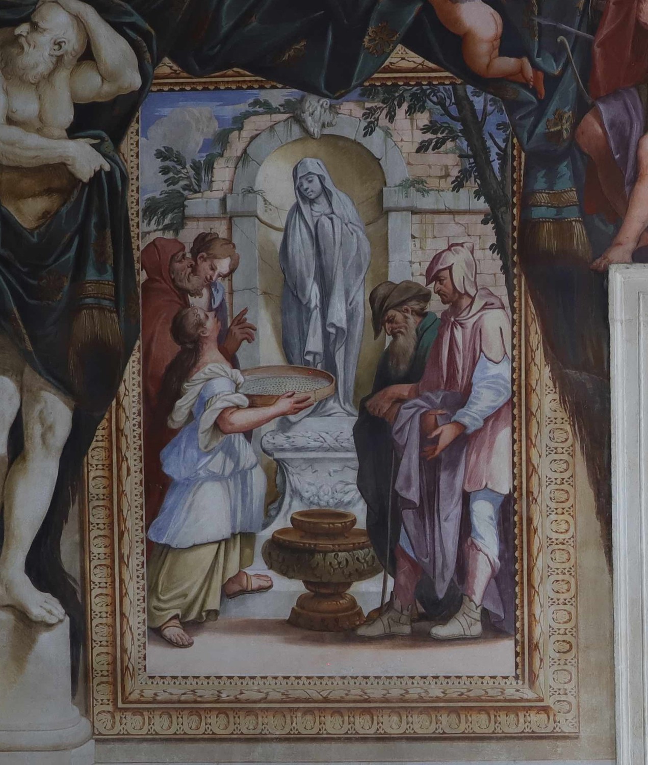 All’interno di una finta cornice in oro è rappresentato l’episodio della vestale Tuccia, che narra di come la fanciulla, accusata di aver violato il voto di castità, fosse miracolosamente riuscita a portare un setaccio pieno d’acqua senza versarne neanche una goccia. Al centro della scena la rappresentazione della statua di pietra della dea Vesta, posizionata su una base con decorazioni in rilievo. La scultura è posizionata all’interno di un arco di pietra con una testa di ariete sulla chiave di volta, all’interno di muro in mattoni circondato da un albero e da vegetazione. Alla destra della statua della vestale, Tuccia è raffigurata vestita con un lungo abito con la parte superiore azzurra con l’estremità delle maniche bianche e la parte inferiore verde. La vestale tiene tra le mani il setaccio. È affiancata da un uomo barbuto con un abito con cappuccio rosso e una figura femminile con il capo chino verso il setaccio. A sinistra della statua altri due personaggi: un uomo con una lunga barba, vestito di verde che si sorregge su un bastone e lo sguardo rivolto verso il basso, e un uomo con una tunica con cappuccio rosa con maniche e calzoni azzurri. Ai piedi della base della statua il braciere del focolare sacro affidato alle vestali, color oro con decorazioni fitoformi.