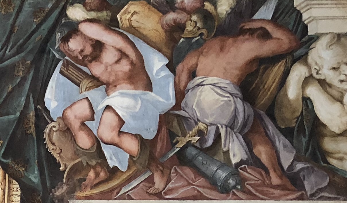 Nel sovrapporta sono rappresentati due uomini circondati da vari oggetti: quello di sinistra è rappresentato con il gomito destra sollevato, coperto da un tessuto panneggiato bianco che parte dalle spalle fino a coprire la parte inferiore del corpo, lasciando scoperte le gambe. Ai suoi piedi una spada con un'aquila dorata sull’estremità. In centro in alto, tra i due soggetti, uno scudo dorato e un elmo dorato con due piume rosse. L’uomo di destra è raffigurato seduto e di spalle, con la mano destra posata sulla testa. È coperto nella parte inferiore del corpo da un tessuto panneggiato bianco, che lascia scoperta la gamba sinistra. A terra, ai piedi dei due personaggi, un tessuto rosso. Sopra di esso, la parte iniziale, color argento, di un ariete, posta in diagonale tra i due uomini. L’arma viene tagliata dal corpo dell’uomo di sinistra, rendendo visibile solo la parte finale in legno dietro al capo del personaggio.