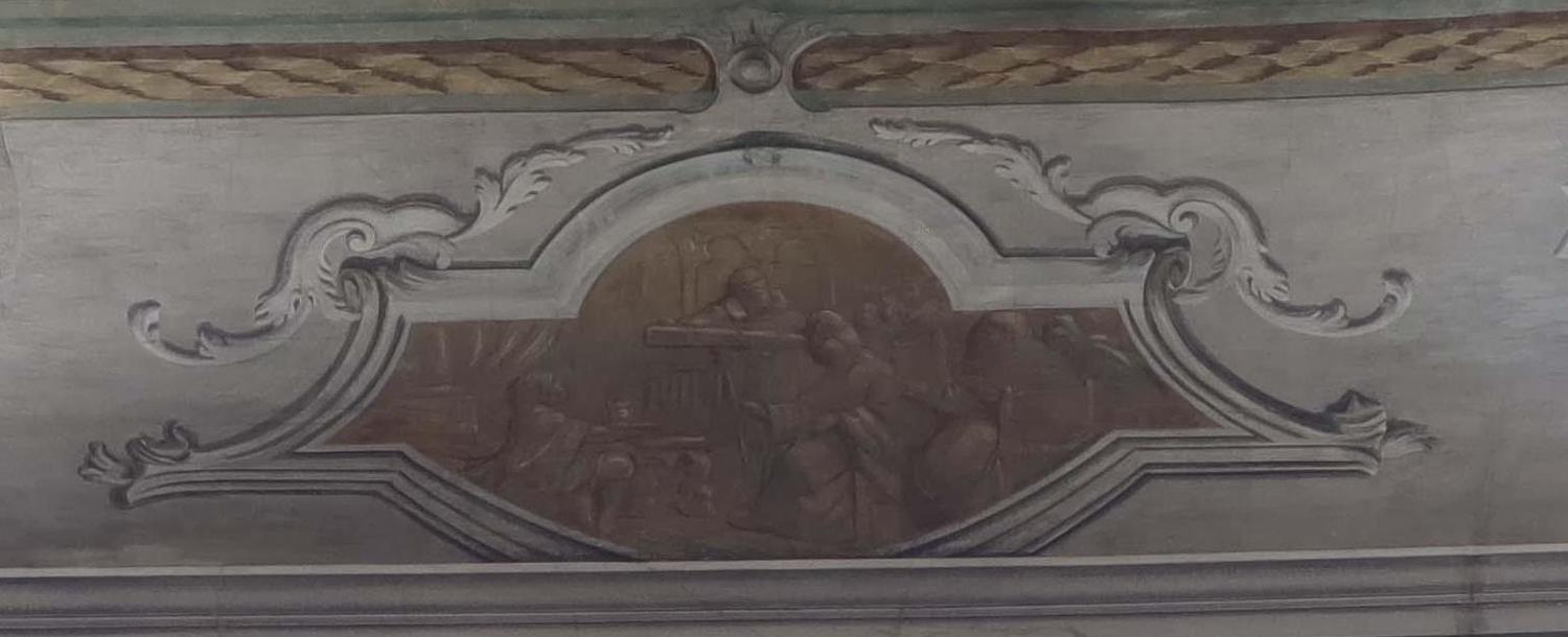 Entro una cornice mistilinea è raffigurato l'episodio di Galileo, che illustra l'invenzione del cannocchiale al doge Leonardo Donà. Al centro della composizione il doge, che seduto guarda dentro il cannocchiale. Alla sua destra, in secondo piano, Galileo, raffigurato in posizione stante con le mani sulla sua invenzione. Altre figure completano la scena: in primo piano sulla sinistra, un giovane servitore in ginocchio che regge una teira, sulla destra sono riconoscibili almeno due spettatori seduti. Chiudono la scena, sulla sinistra, un tendaggio che scende da una colonna, di cui si intravede la base, e, sullo sfondo, una struttura architettonica ad arco.