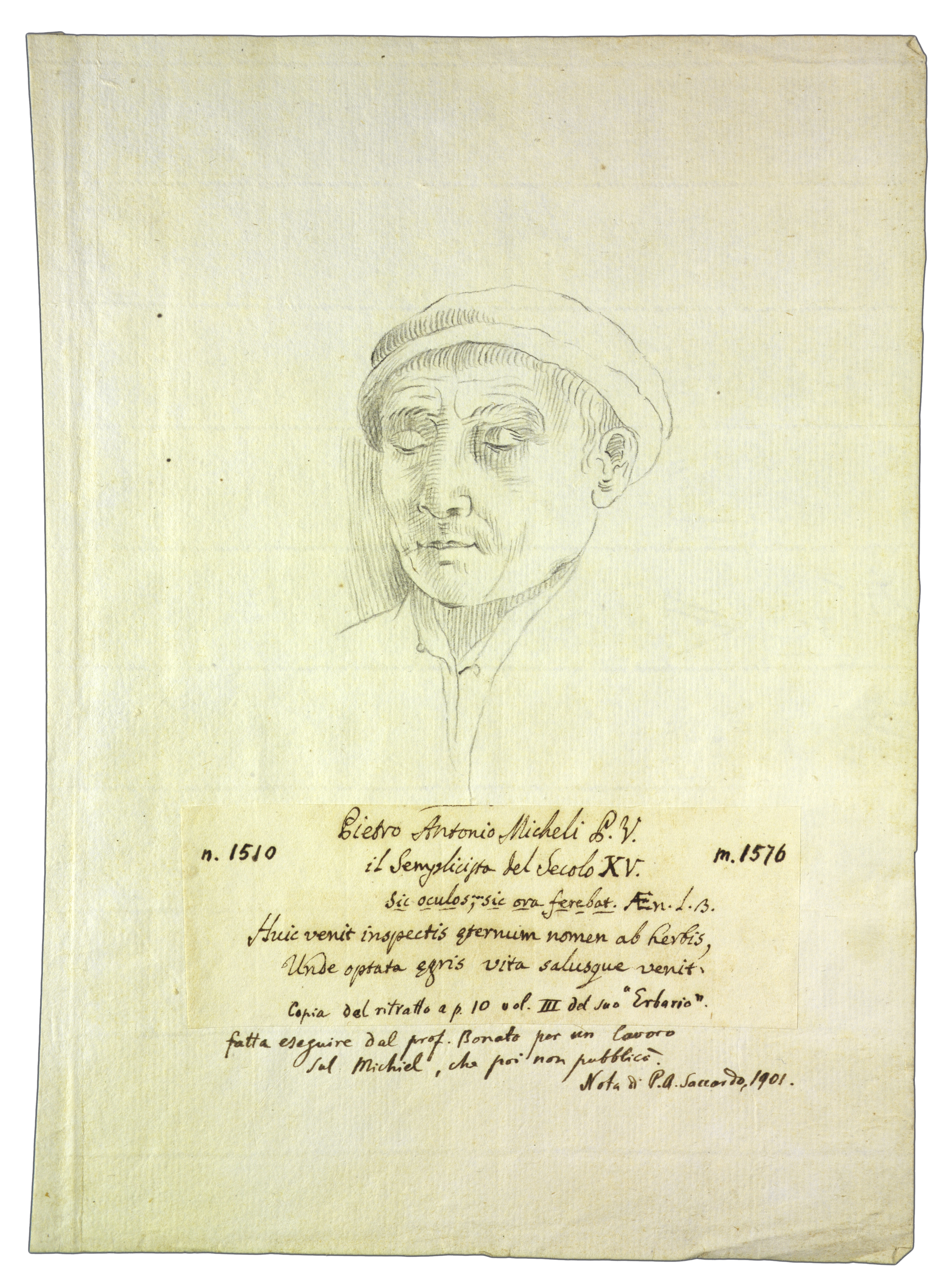 Titolo manoscritto su carta incollata sul recto, dove compare anche la nota: il semplicista del Secolo XV. sic oculos, sico ora ferebat. Aen. 1. B. Huic venit inspectis eternium nomen ab herbis, unde optata aegris vita salusque venit. Copia del ritratto a p. 10 vol. III del suo "Erbario" fatta eseguire dal prof. Bonato per un lavoro sul Michiel, che poi non pubblicò. Nota di P. A. Saccardo, 1901