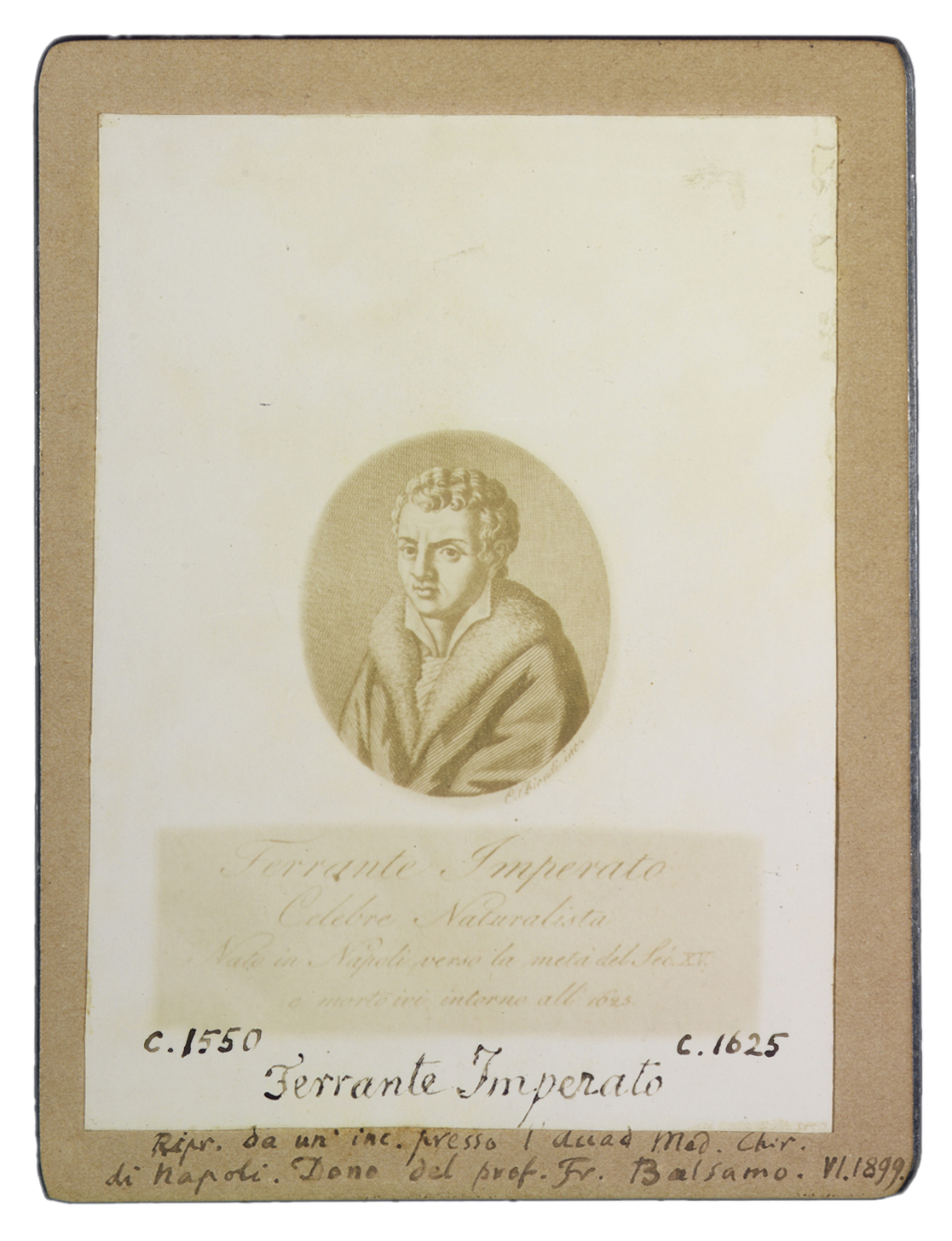 Titolo manoscritto sul recto, dove compaiono le note manoscritte: Ripr. da un’ inc. presso l’Accad. Med. Chir. di Napoli; Dono del prof. Fr. Balsamo. VI.1899. A stampa invece compare: celebre naturalista, nato in Napoli verso la metà del Sec. XV e morto ivi intorno all'1625.