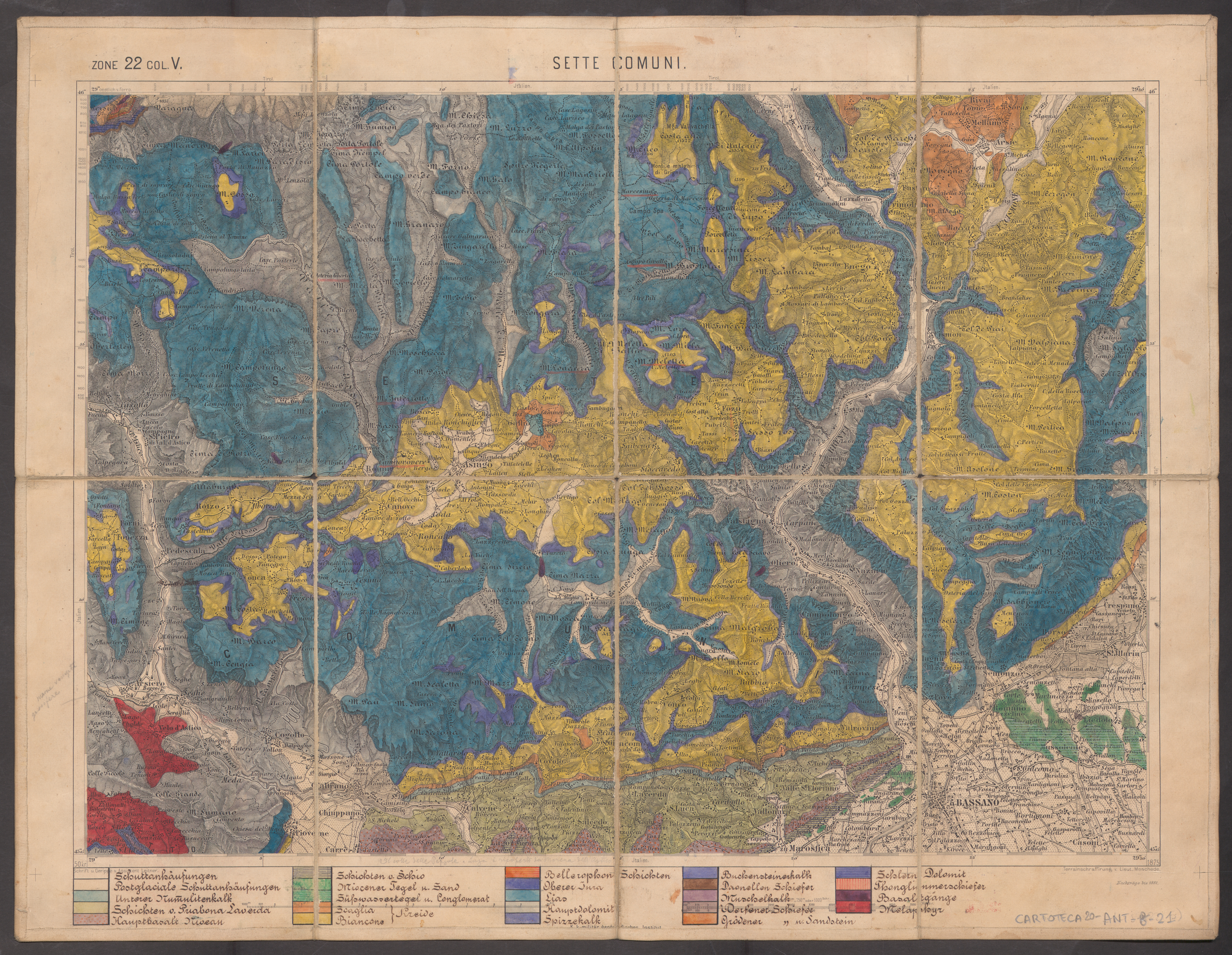 Rilevamento disegnato sulla base topografica di: Sette Comuni - Zone 22, Kol. V della Spezialkarte der im Reichsrate vertretenen Königreiche und Länder der Österreichisch-Ungarischen Monarchie i.M. 1:75 000 (Wien : K. K. Geologischen Reichsanstalt, s.d.).