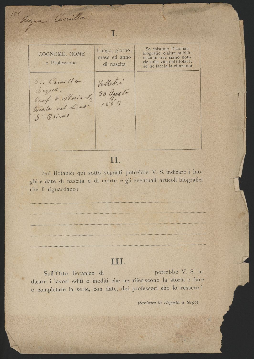Modulo di raccolta dati su Camillo Aigna