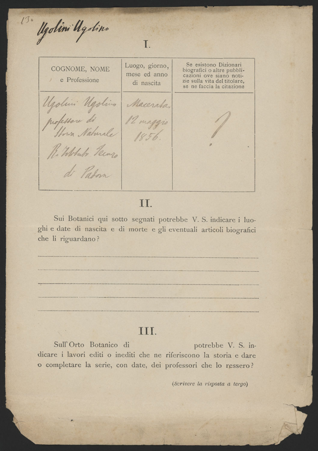 Modulo di raccolta dati su Ugolino Ugolini