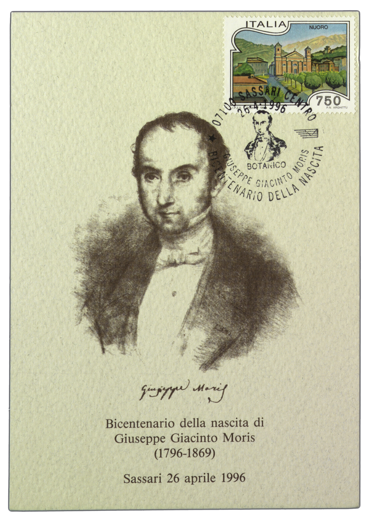 Titolo e data di pubblicazione sul recto, dov'è incollato il francobollo. Presente timbro a inchiostro sul recto e sul verso: 07100 Sassari centro 26.4.1996 Botanico Giuseppe Giacinto Moris Bicentenario della nascita.