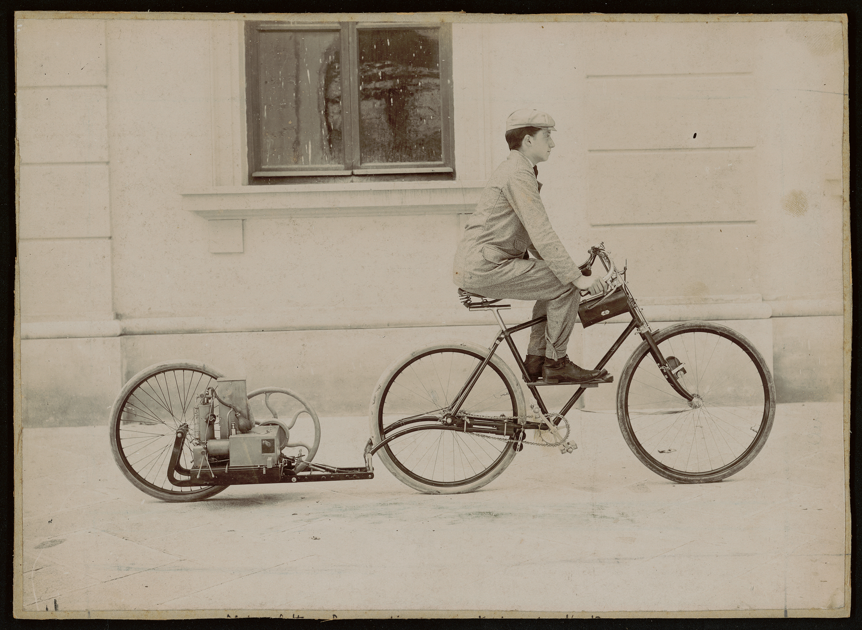 Bicicletta spinta da un "carrello motore per veicoli su strade ordinarie" (brevetto n. 38.928 rilasciato a Bernardi il 27/5/1895) utilizza il motore "Lauro", 1/3 hp