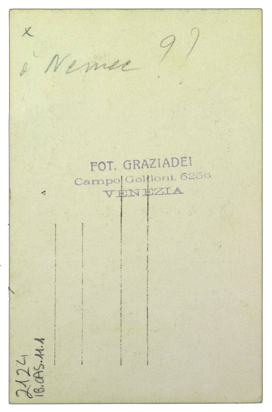 Nota manoscritta sul verso: a Nemec??. Sempre sul verso presente anche timbro a inchiostro: Fot. Graziadei Campo Goldoni, 5256 Venezia.