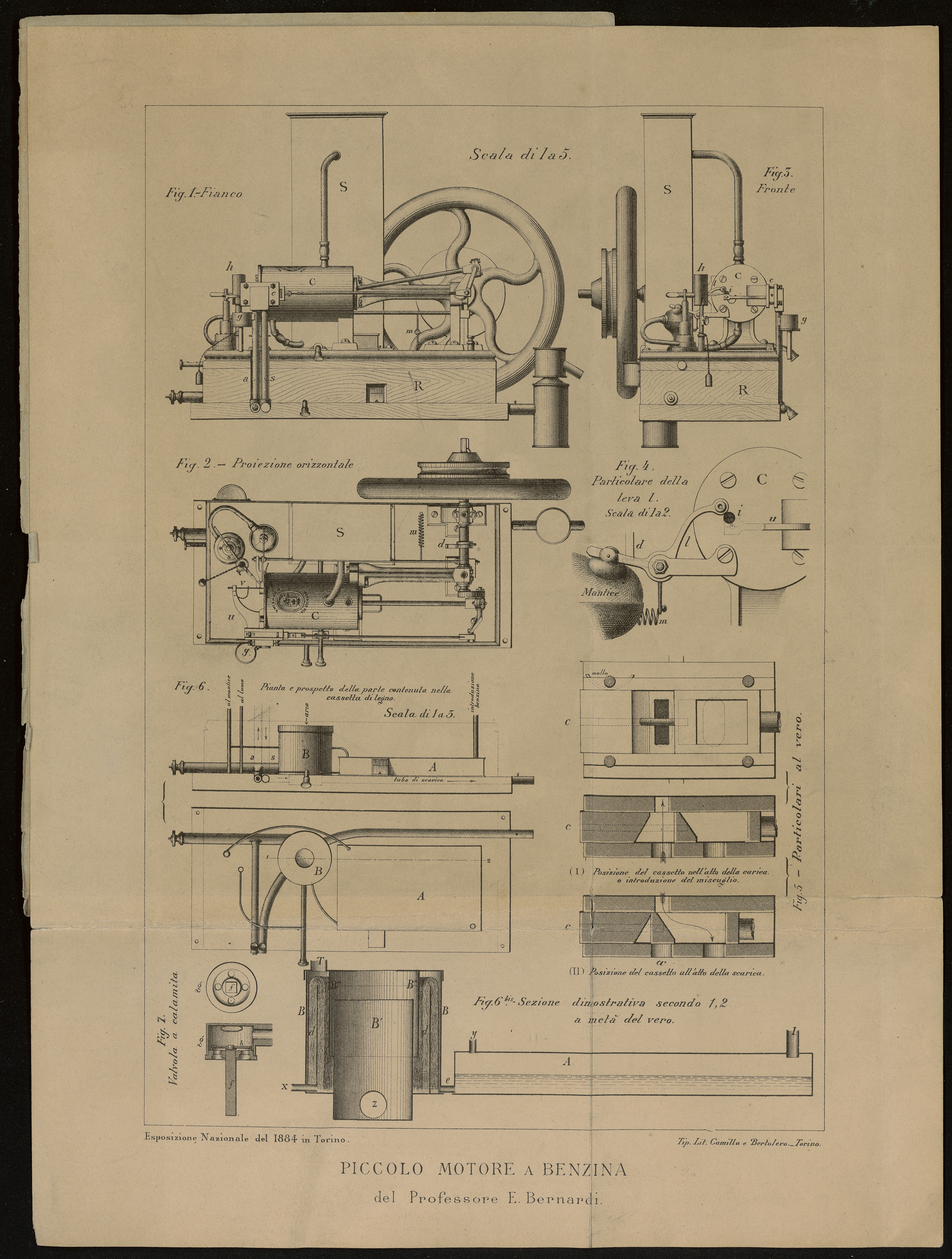 Diversi disegni originali relativi al motore a benzina, presentato da Enrico Bernardi all'Esposizione Nazionale di Torino dell'anno 1884 e qui premiato con una medaglia d'argento dalla Commissione Giudicatrice delle invenzioni (di cui era relatore l'ingegner Modesto Panetti).