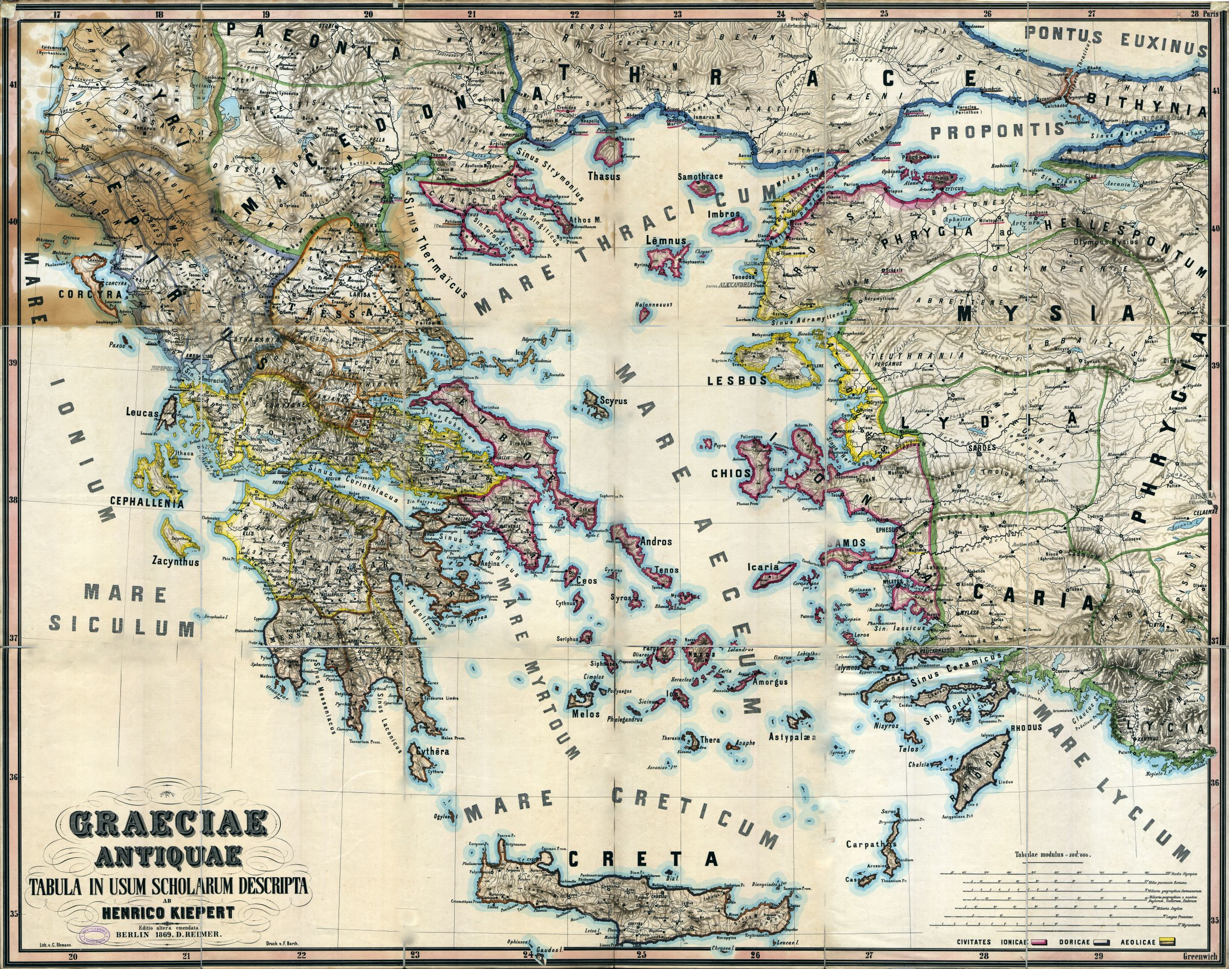 Greciae Antiquae Tabula in usum scholarum descripta ab Henico Kiepert. Editio altera emendata. Berlin 1869. D.Reimer. lingua: latino. Posizione: in basso a sinistra.