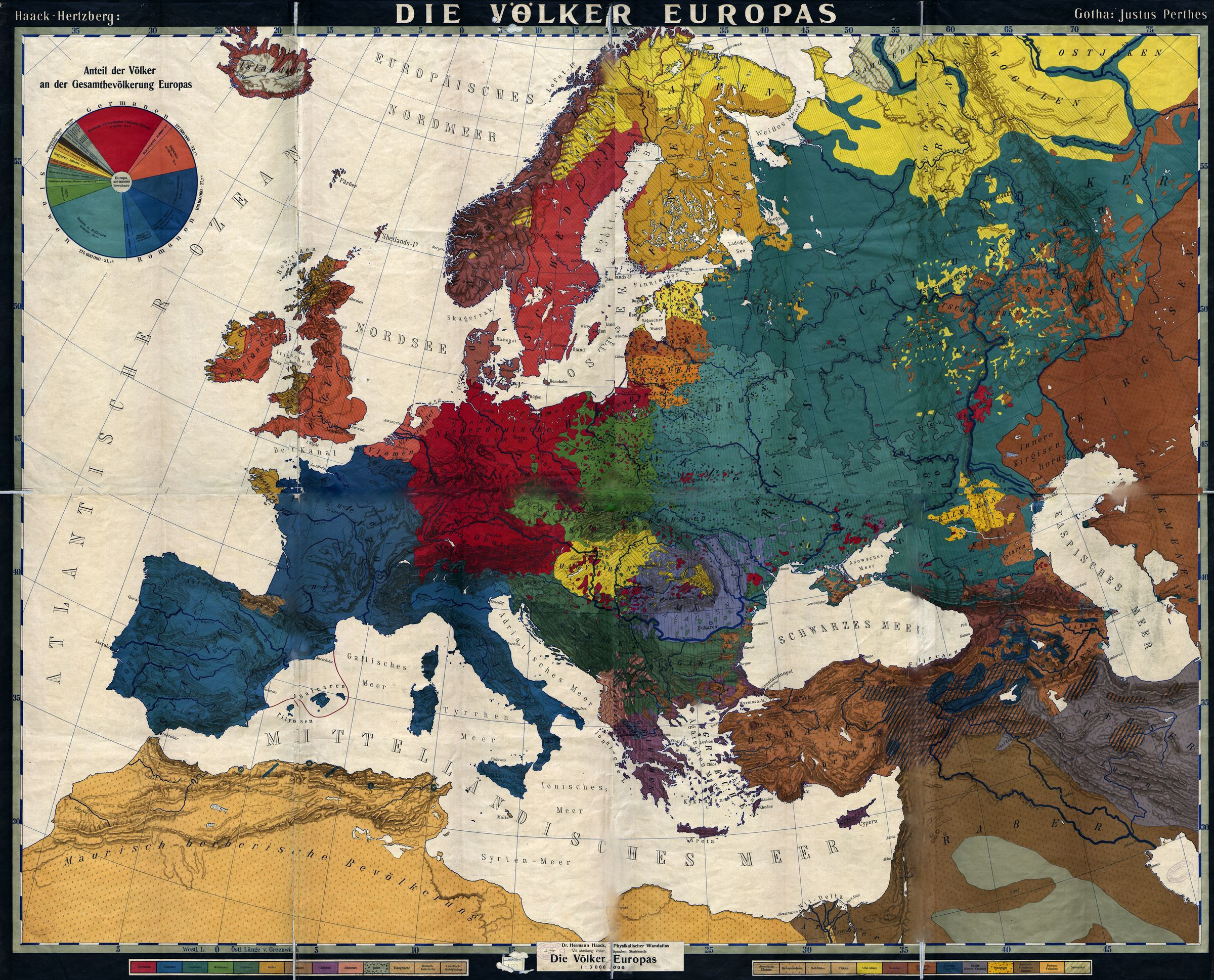 Cartiglio: Dr. Hermann Haack, Die völker Europas. Physikalisker Wandatlas VII Abteilung: Völker, Sprachen, Staatskunde 1:3.000.000. ligua: tedesco. Posizione: in basso al centro.