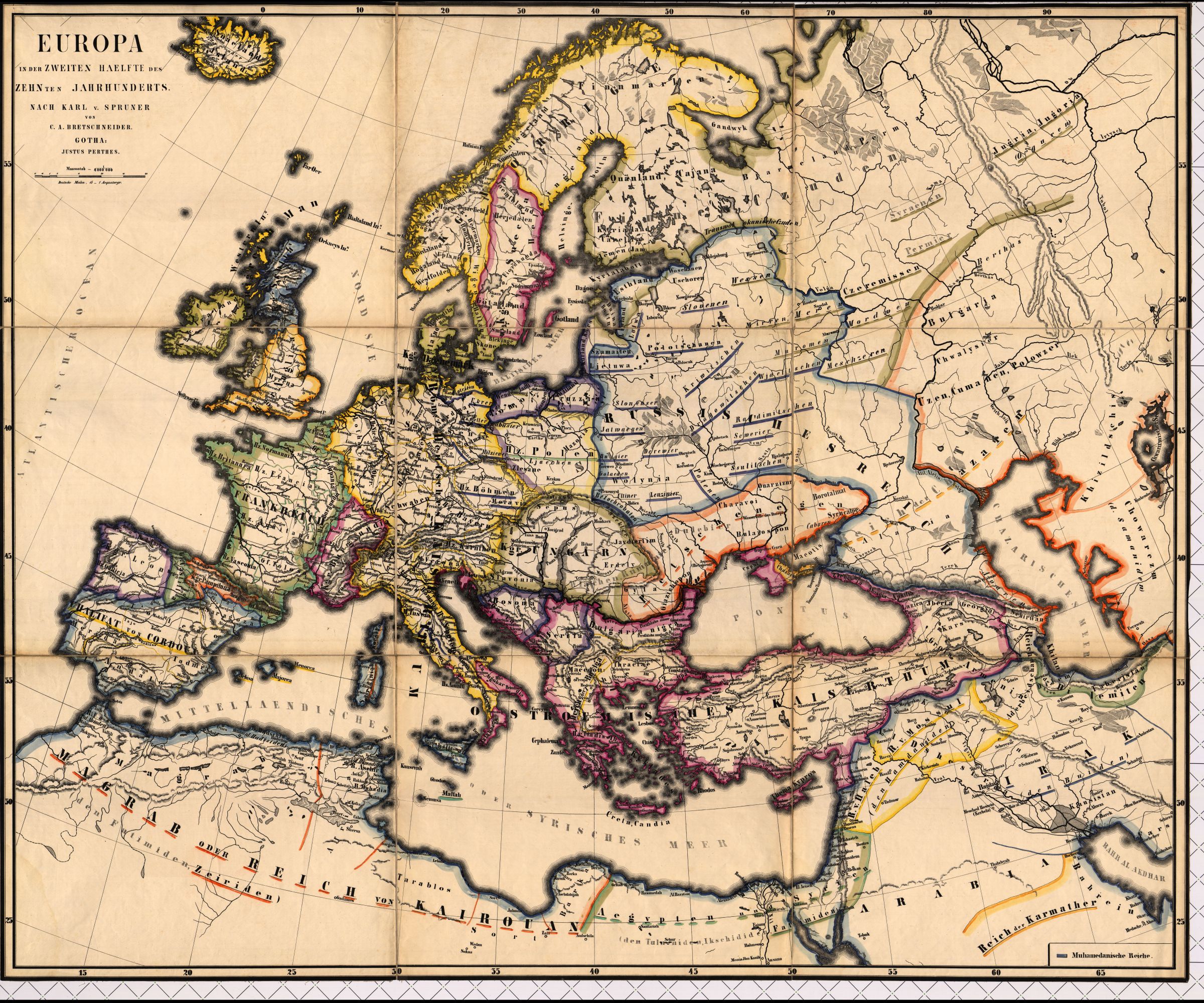 Cartiglio: Europa in der Zweiten Hälfte des Zehnten Jahrhunderts. Nach Karl v. Spruner von C. A. Bretschneider. Gotha: Justus Perthes.