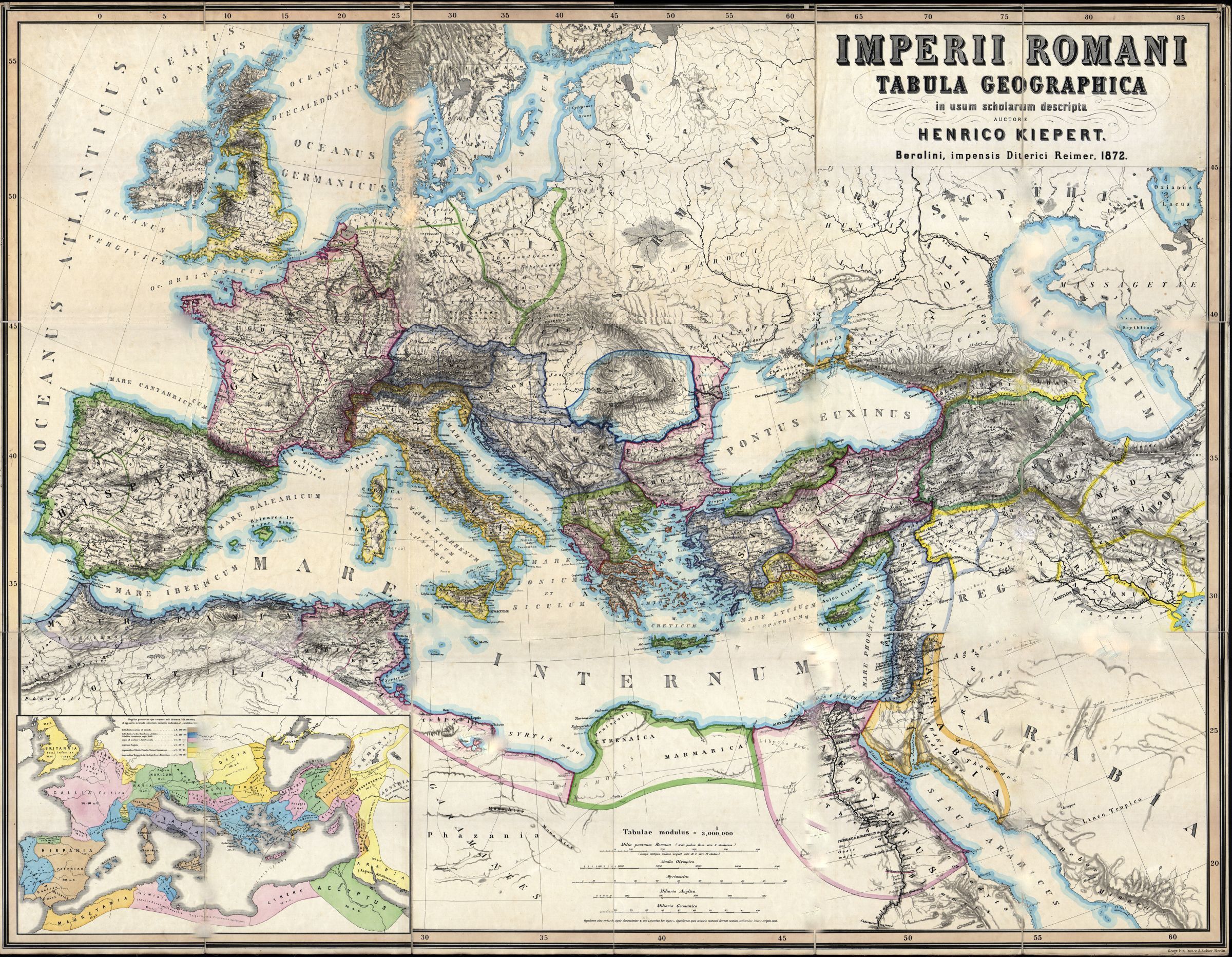 Cartiglio: Imperii Romani Tabula Geographica in usum scholarum descripta auctore Henrico Kiepert. Berolini, Impensis Diterici Reimer, 1872.