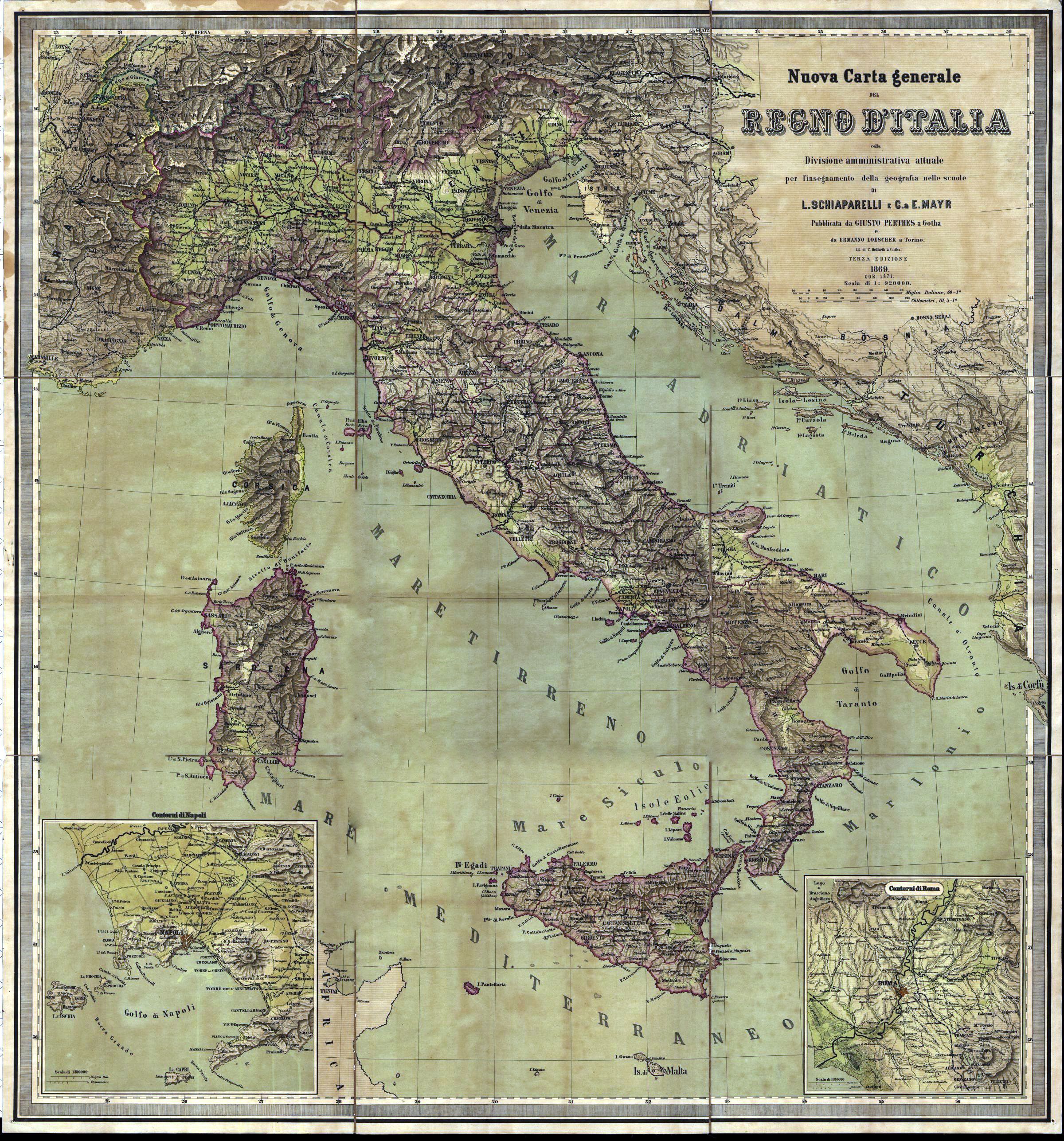 Cartiglio: Nuova carta generale del Regno d'Italia colla divisione amministrativa attuale per l’insegnamento della geografia nelle scuole di L. Schiaparelli e C. & E. Mayr. Pubblicata da Giusto Perthes a Gotha e da Ermanno Loescher a Torino Lith. Di C. Hellfarth a Gotha, Terza edizione 1869 cor. 1871.