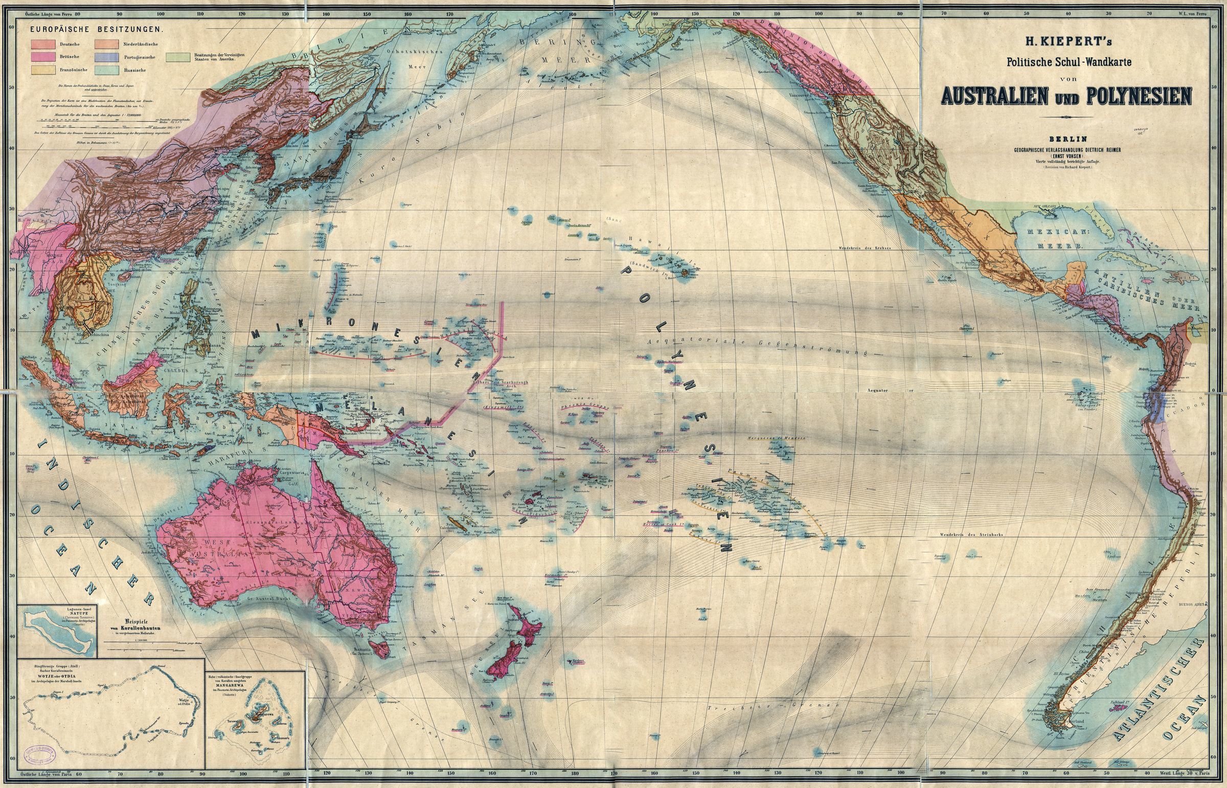 Cartiglio: H. Kiepert's Politische Schul-Wandkarte von Australien und Polynesien. Berlin Geographische Verlagshandlung Dietrich Reimer (Ernst Vohsen) Vierte Vollständig berichtigte Auflage (Revision von Richard Kiepert).