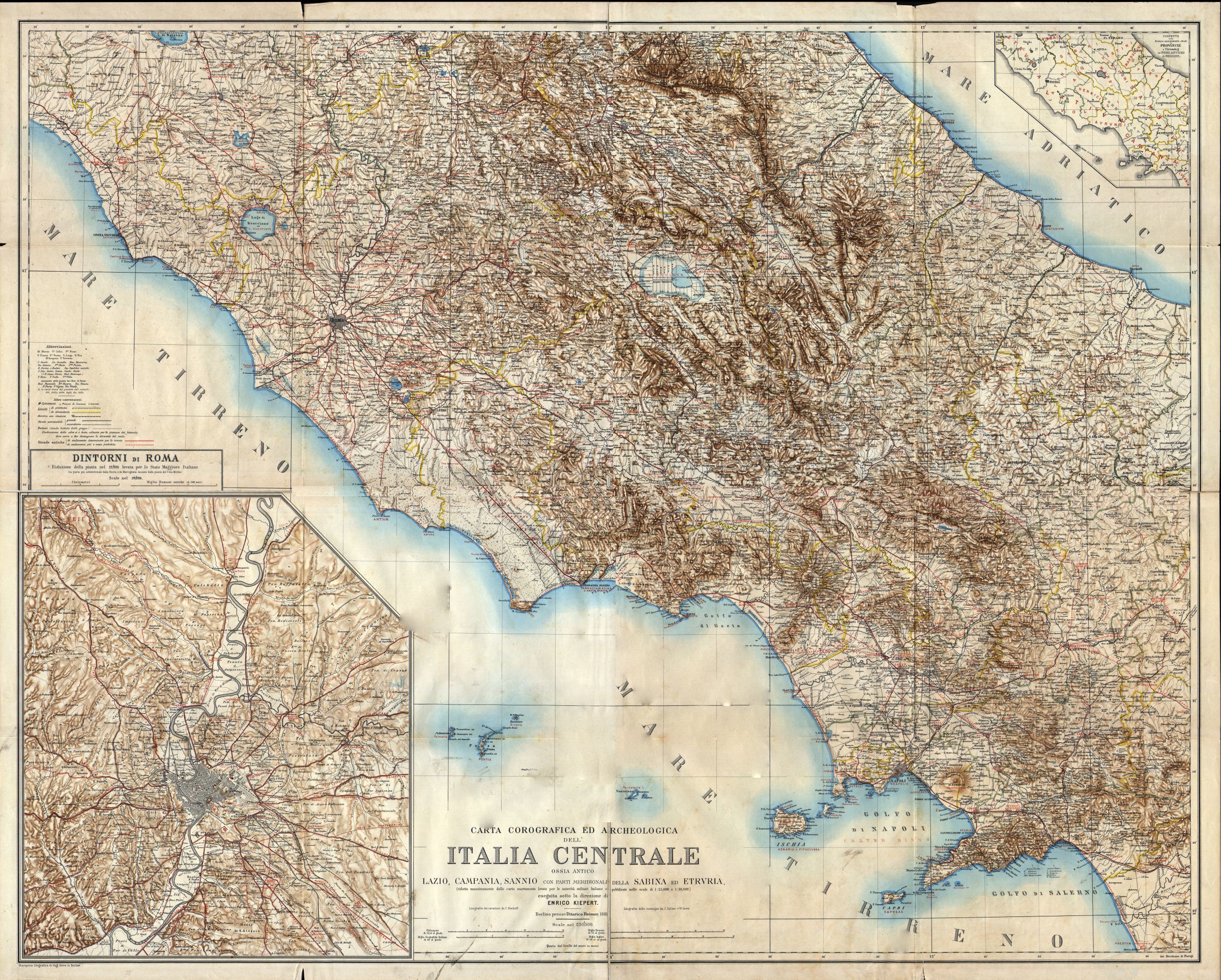 Cartiglio: Carta Corografica ed Archeologica dell'Italia Centrale ossia Antico Lazio, Campania, Sannio con parti meridionali della Sabina ed Etruria (ridotta massimamente dalle carte nuovamente levate per le autorità militari italiane e pubblicate nelle scale di 1: 25.000 e 1: 50.000) eseguita sotto la direzione di Enrico Kiepert.