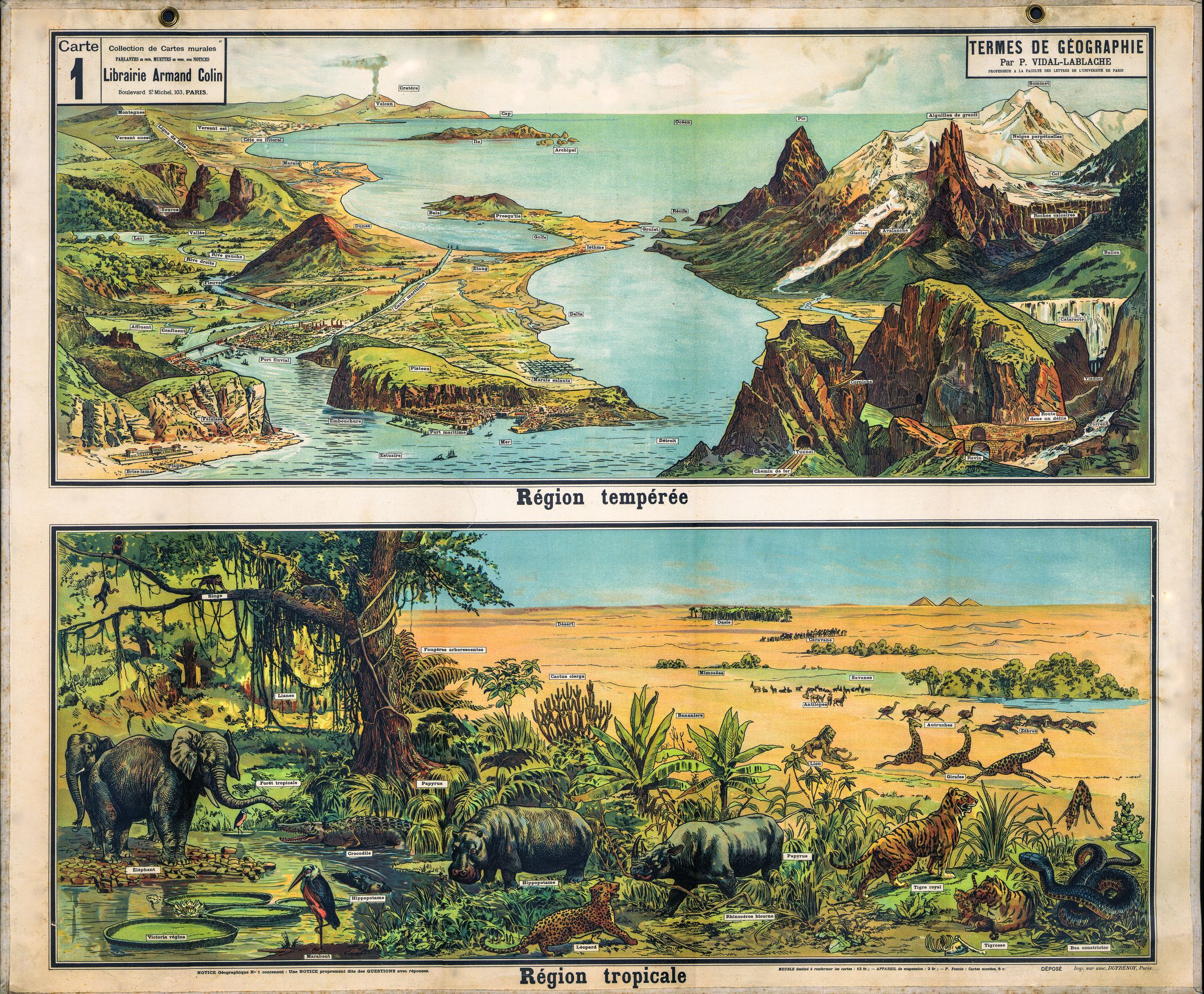 La tavola fa parte dell’Atlante murale di Paul Vidal de la Blache, pubblicato dal 1885 agli anni Sessanta del XX secolo. Si tratta del recto della tavola introduttiva, riservata all’illustrazione dei principali termini geografici. Nello specifico, presenta le vedute di un ideale paesaggio temperato (Région tempérée) e di un ideale paesaggio tropicale (Région tropicale). Alcuni elementi del paesaggio, alcuni esemplari di flora e fauna, alcuni prodotti caratteristici e alcune attività antropiche sono accompagnati da didascalie che specificano il corrispettivo termine geografico.