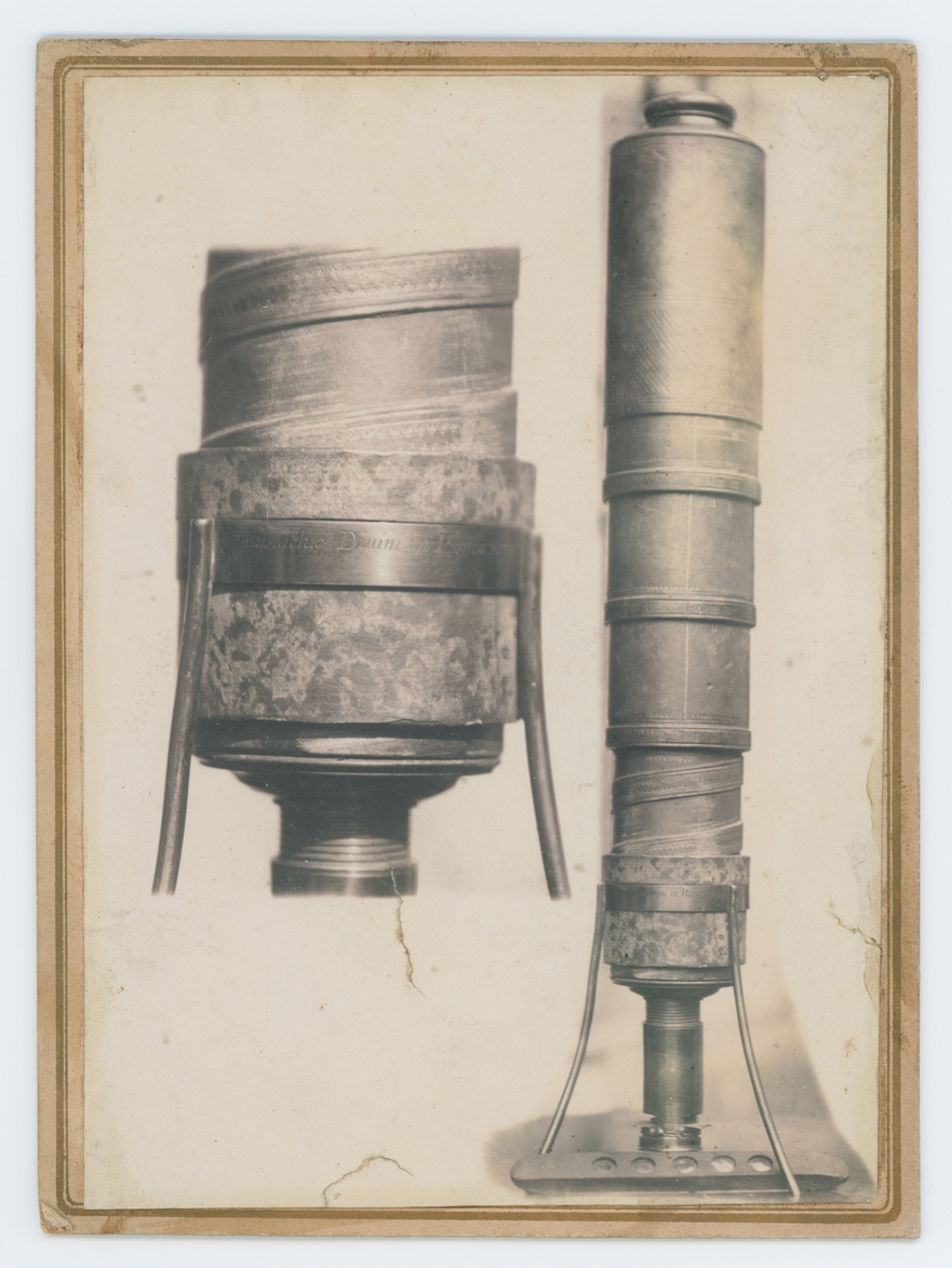 Sul verso nota manoscritta di Achille Forti: "Microscopio composto di Eustachio Divini (1671) - conservato nel Museo di Fisica dell'Università di Padova - di cui faceva uso il fondatore dell'Istologia vegetale Marcello Malpighi".
