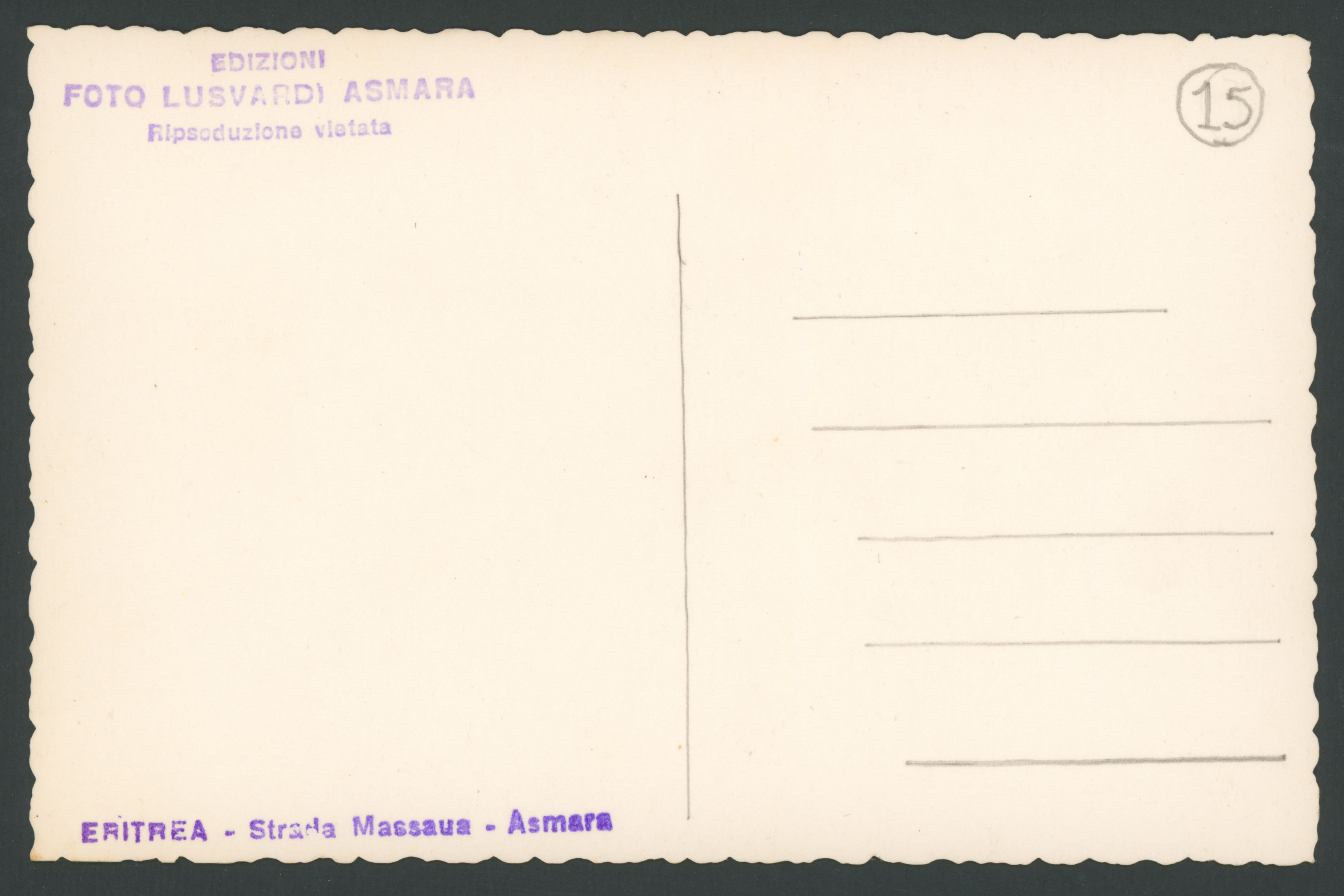 Timbri sul verso: Edizioni Foto Lusvardi asmara Ripsoduzione [i.e. riproduzione] vietata; Eritrea - Strada Massaua - Asmara