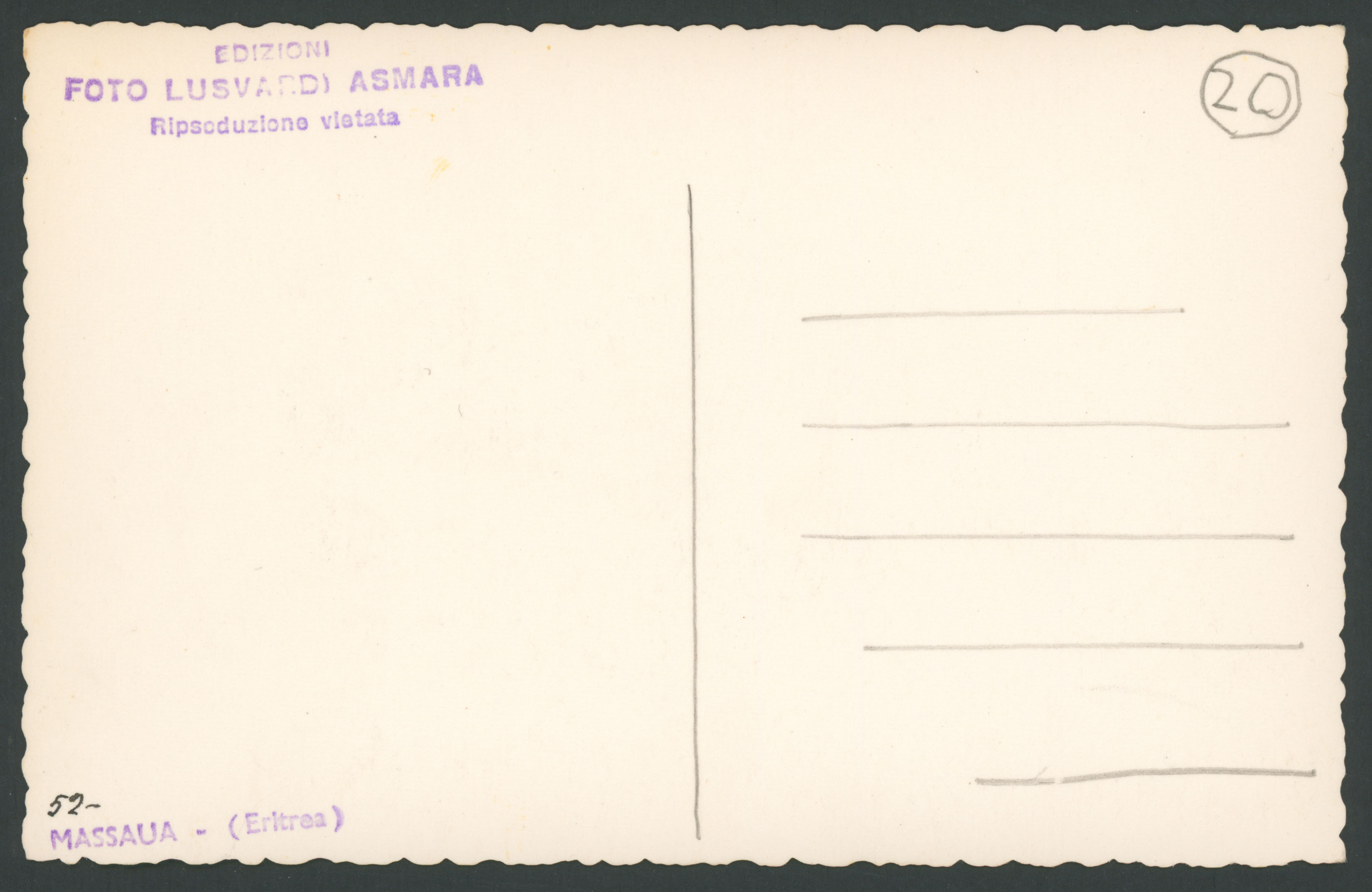 Timbri sul verso: Edizioni Foto Lusvardi Asmara Ripsoduzione [i.e. riproduzione] vietata; Massaua - (Eritrea)
