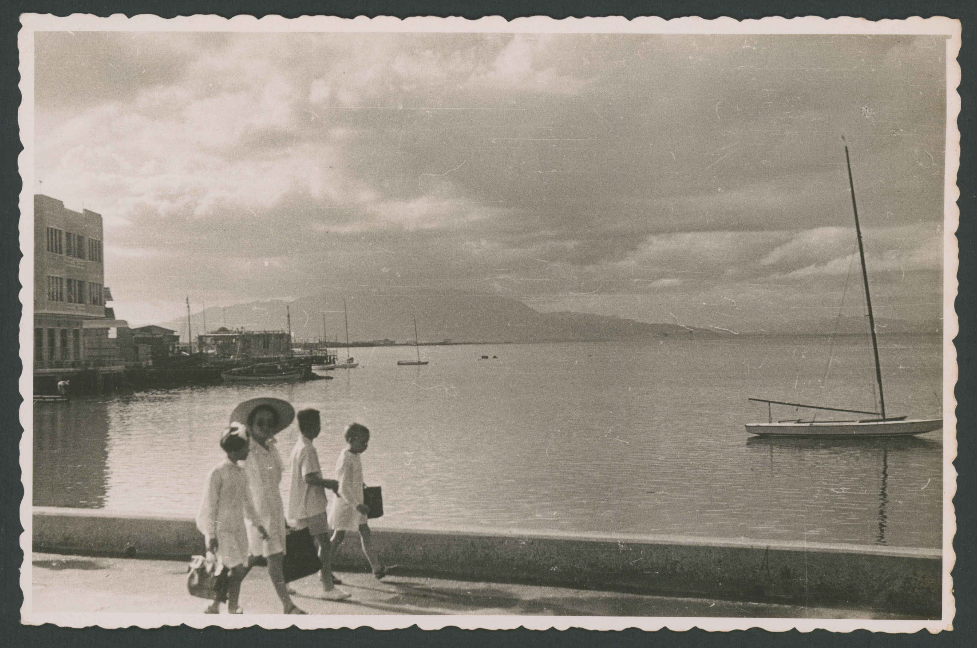 Una donna e tre bambini sul lungomare con porto di Massaua (Eritrea) sullo sfondo
