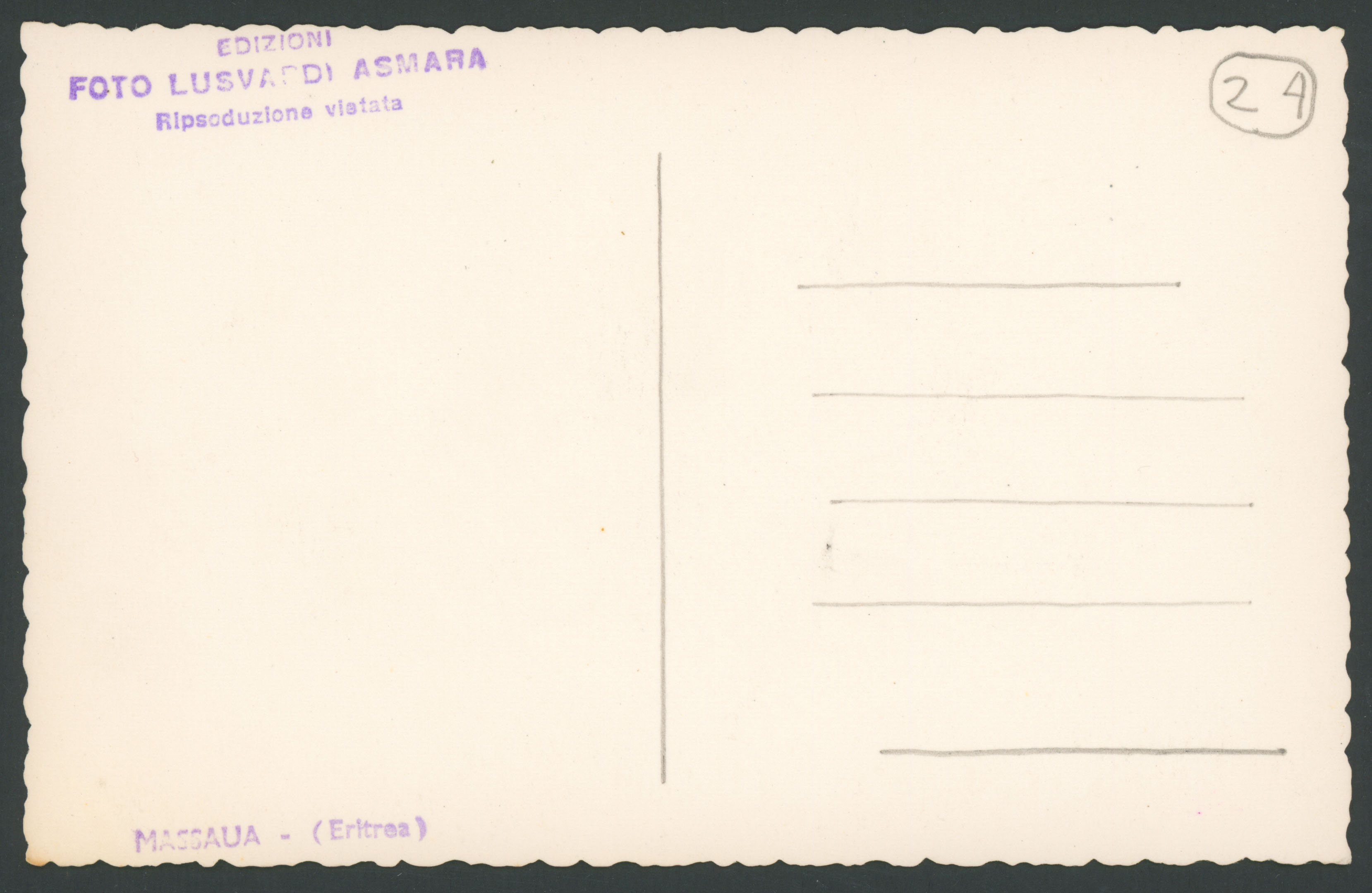 Timbri sul verso: Edizioni Foto Lusvardi Asmara Ripsoduzione [i.e. riproduzione] vietata; Massaua - (Eritrea)