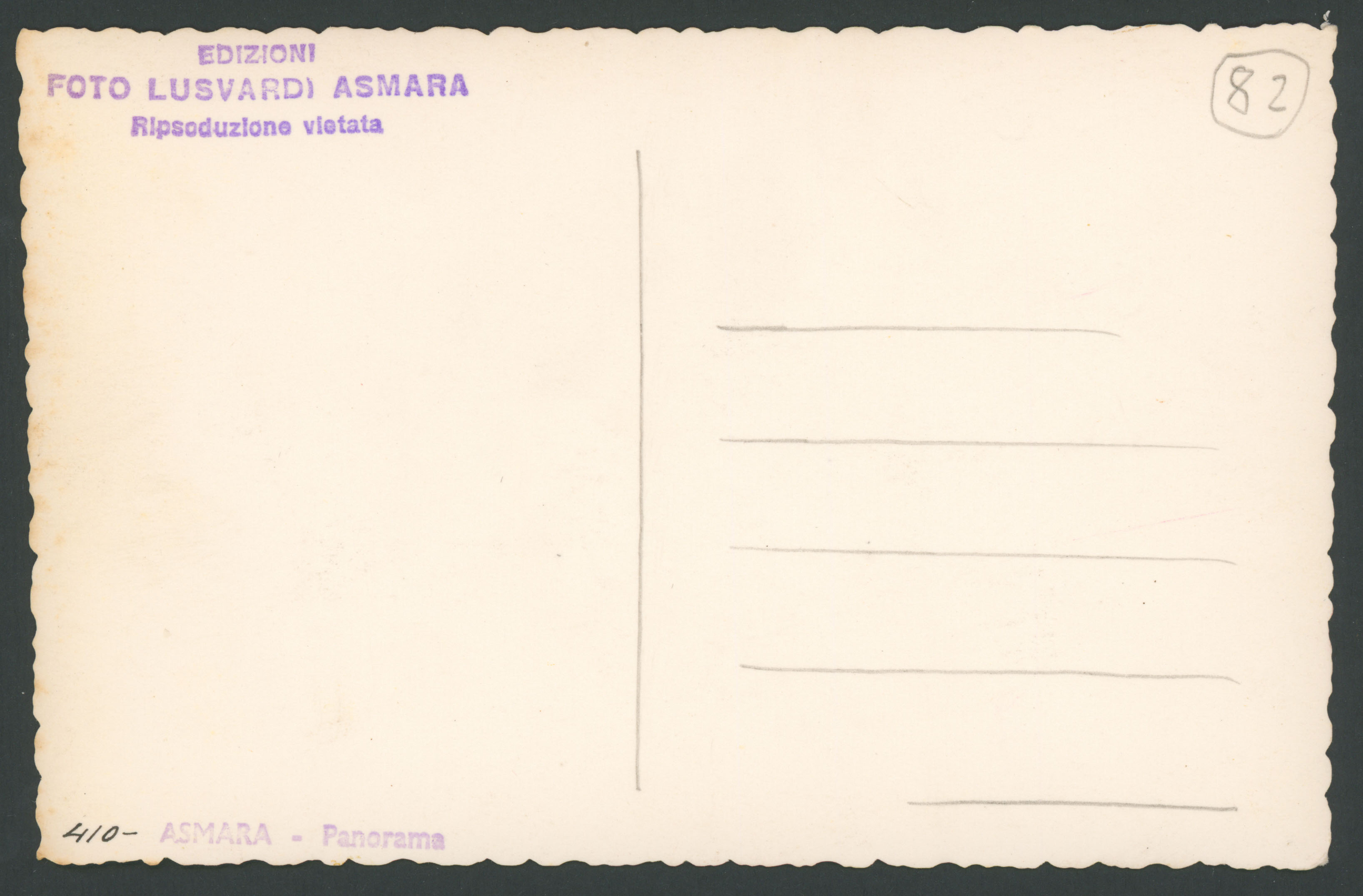 Timbri sul verso: Edizioni Foto Lusvardi Asmara Ripsoduzione [i.e. riproduzione] vietata; Asmara - Panorama