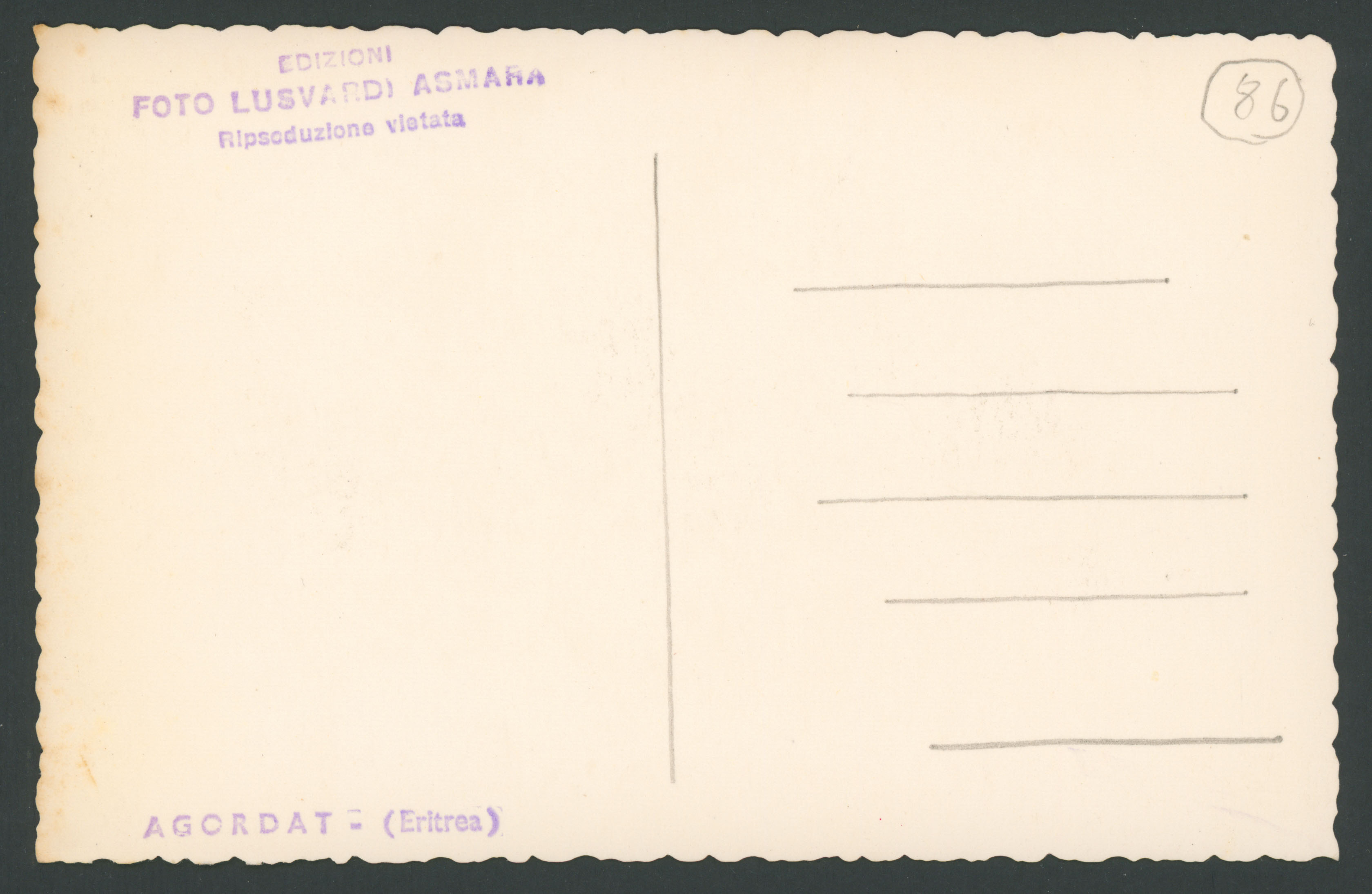 Timbri sul verso: Edizioni Foto Lusvardi Asmara Ripsoduzione [i.e. riproduzione] vietata; Agordat - (Eritrea)