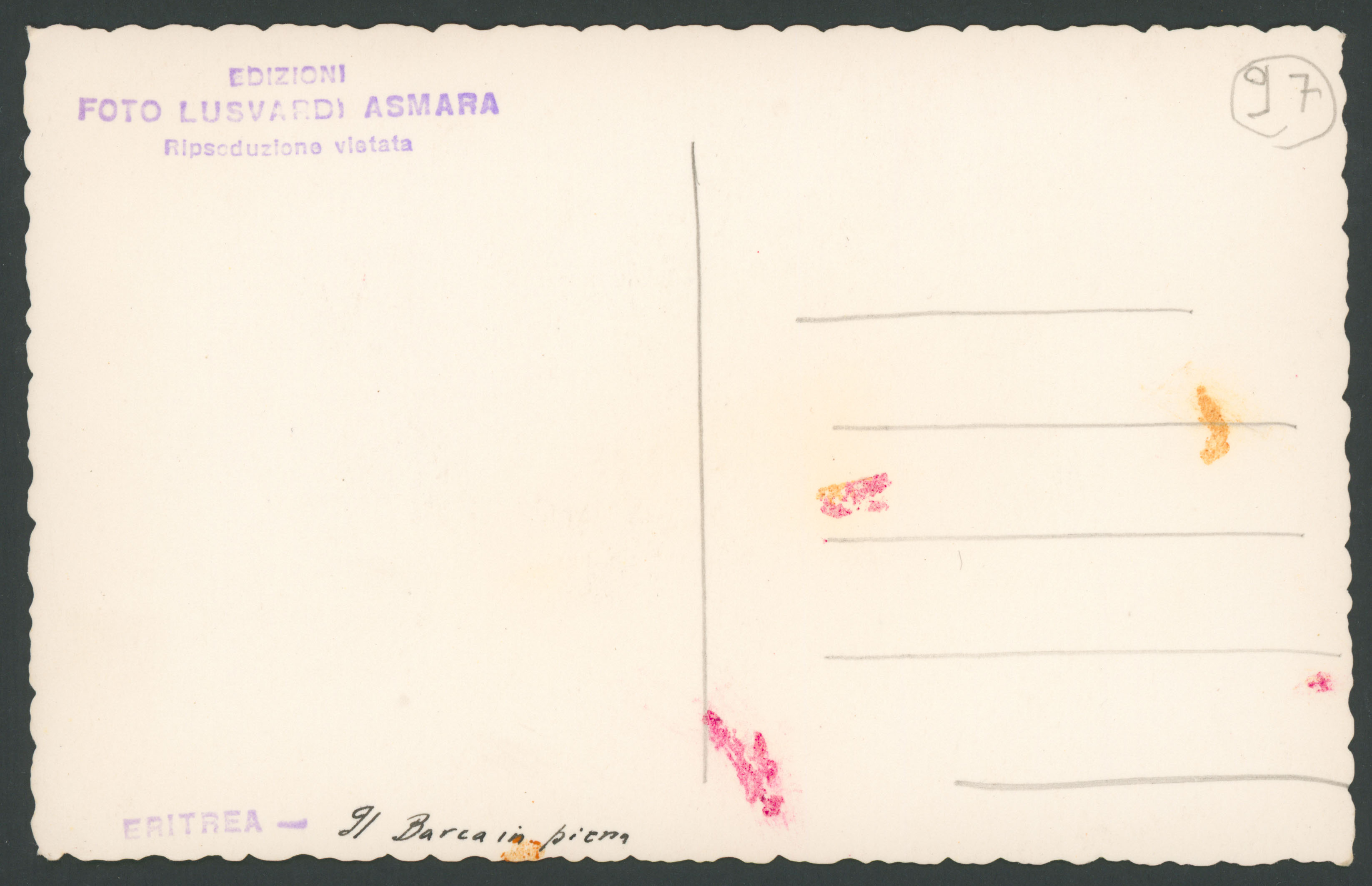 Timbri sul verso: Edizioni Foto Lusvardi Asmara Ripsoduzione [i.e. riproduzione] vietata; Eritrea
