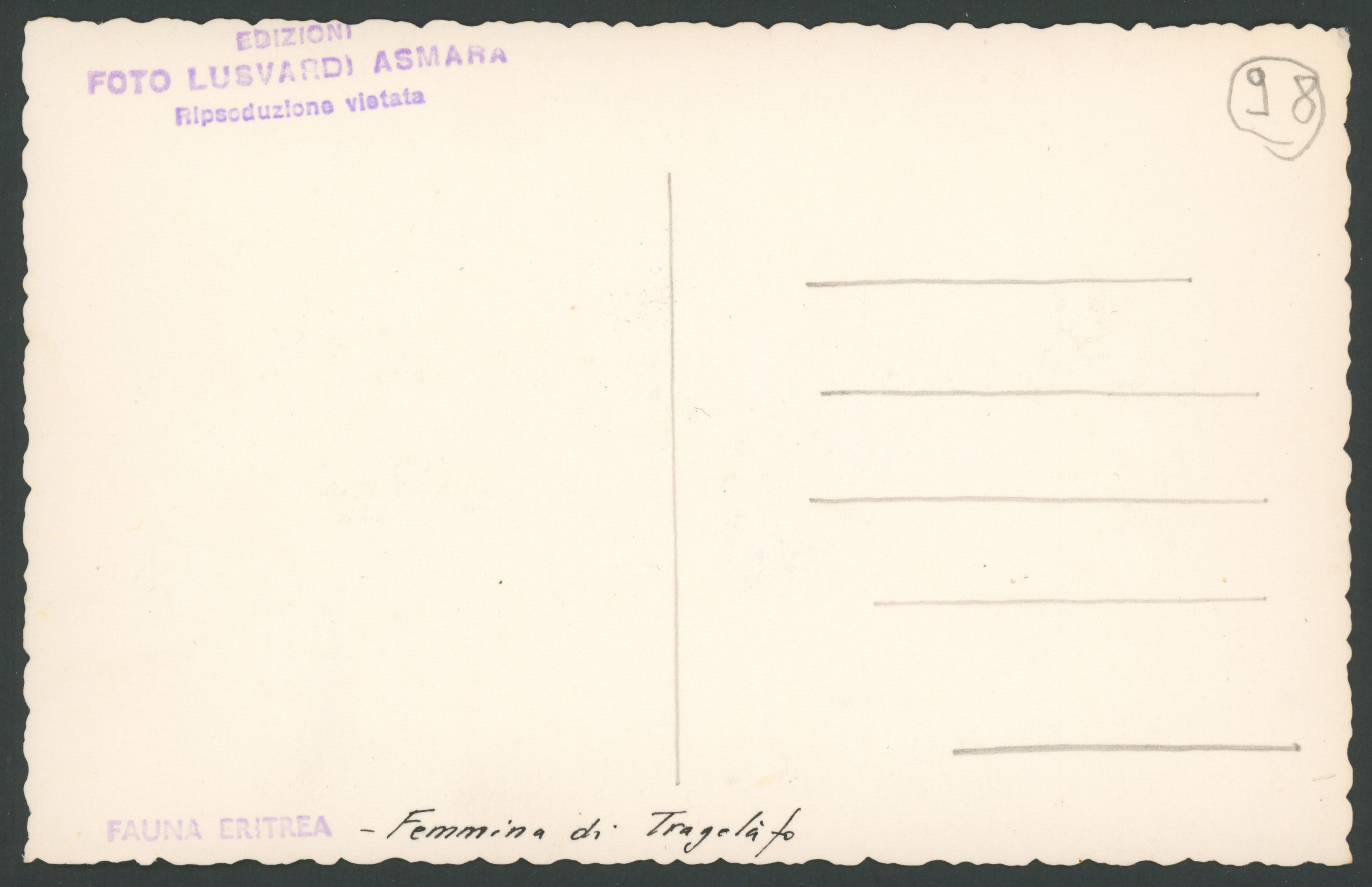 Timbri sul verso: Edizioni Foto Lusvardi Asmara Ripsoduzione [i.e. riproduzione] vietata; Fauna Eritrea