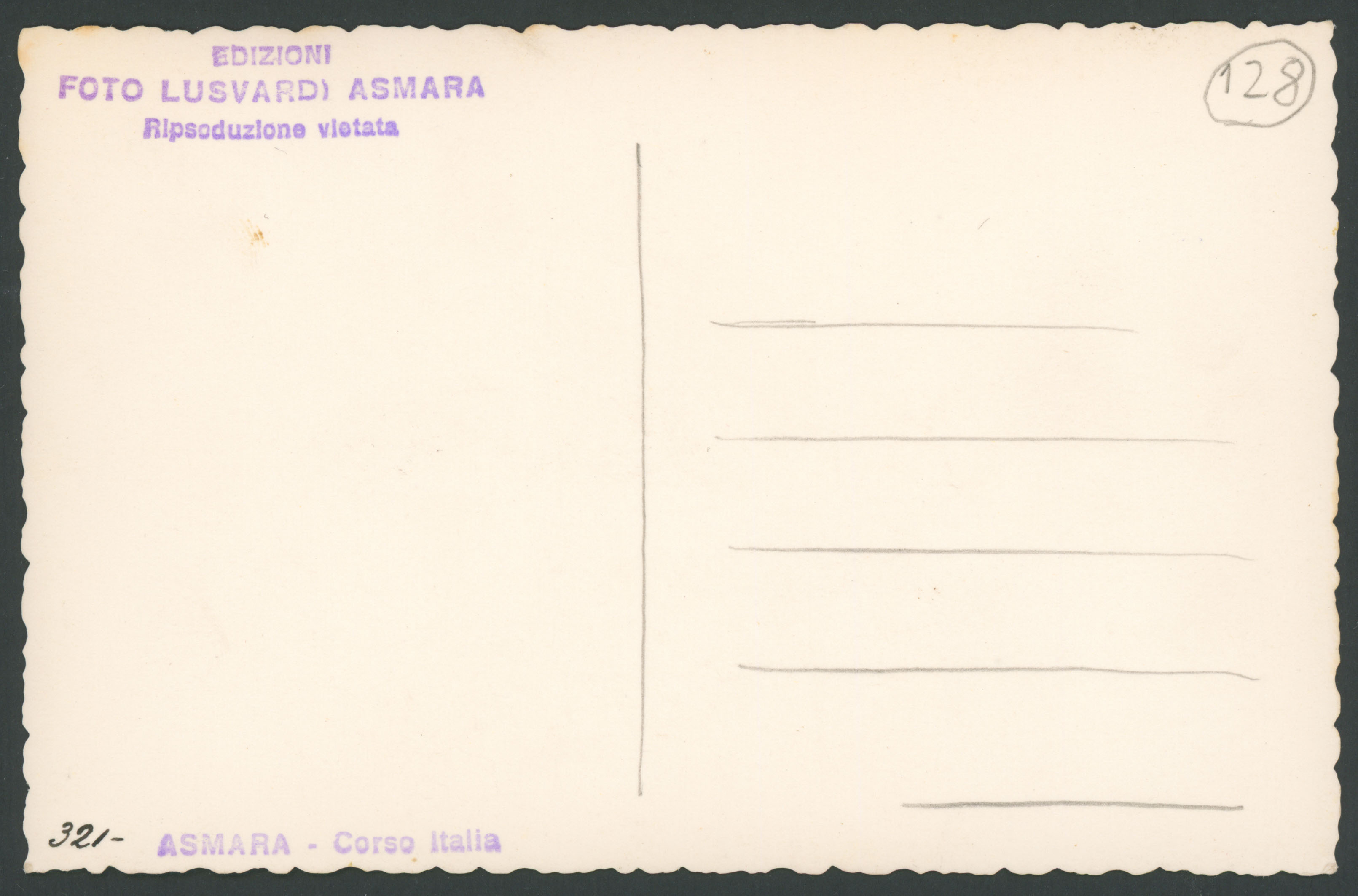 Timbri sul verso: Edizioni Foto Lusvardi Asmara Ripsoduzione [i.e. riproduzione] vietata; Asmara - Corso Italia