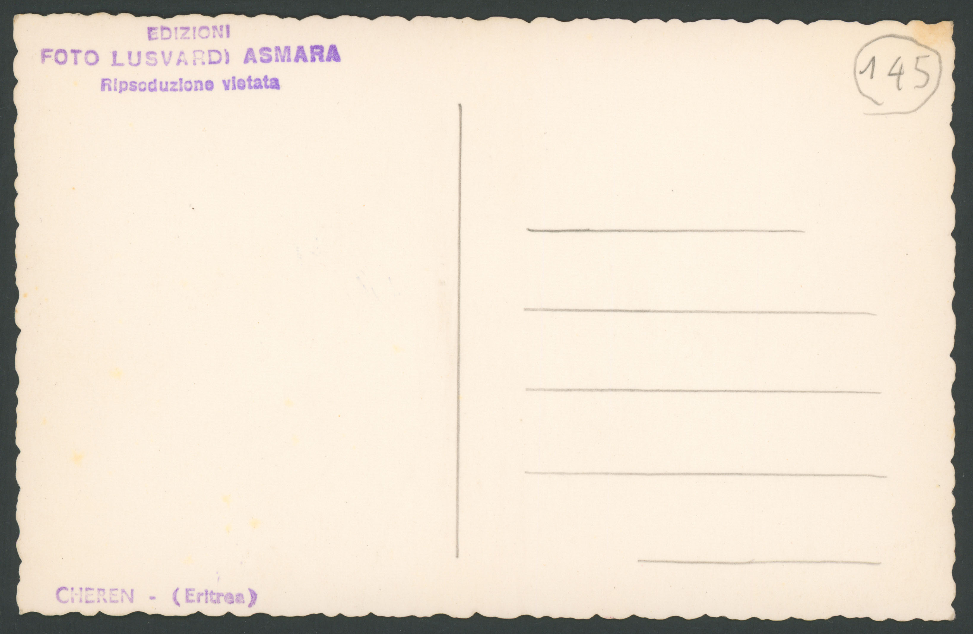Timbri sul verso: Edizioni Foto Lusvardi Asmara Ripsoduzione [i.e. riproduzione] vietata; Cheren - (Eritrea)