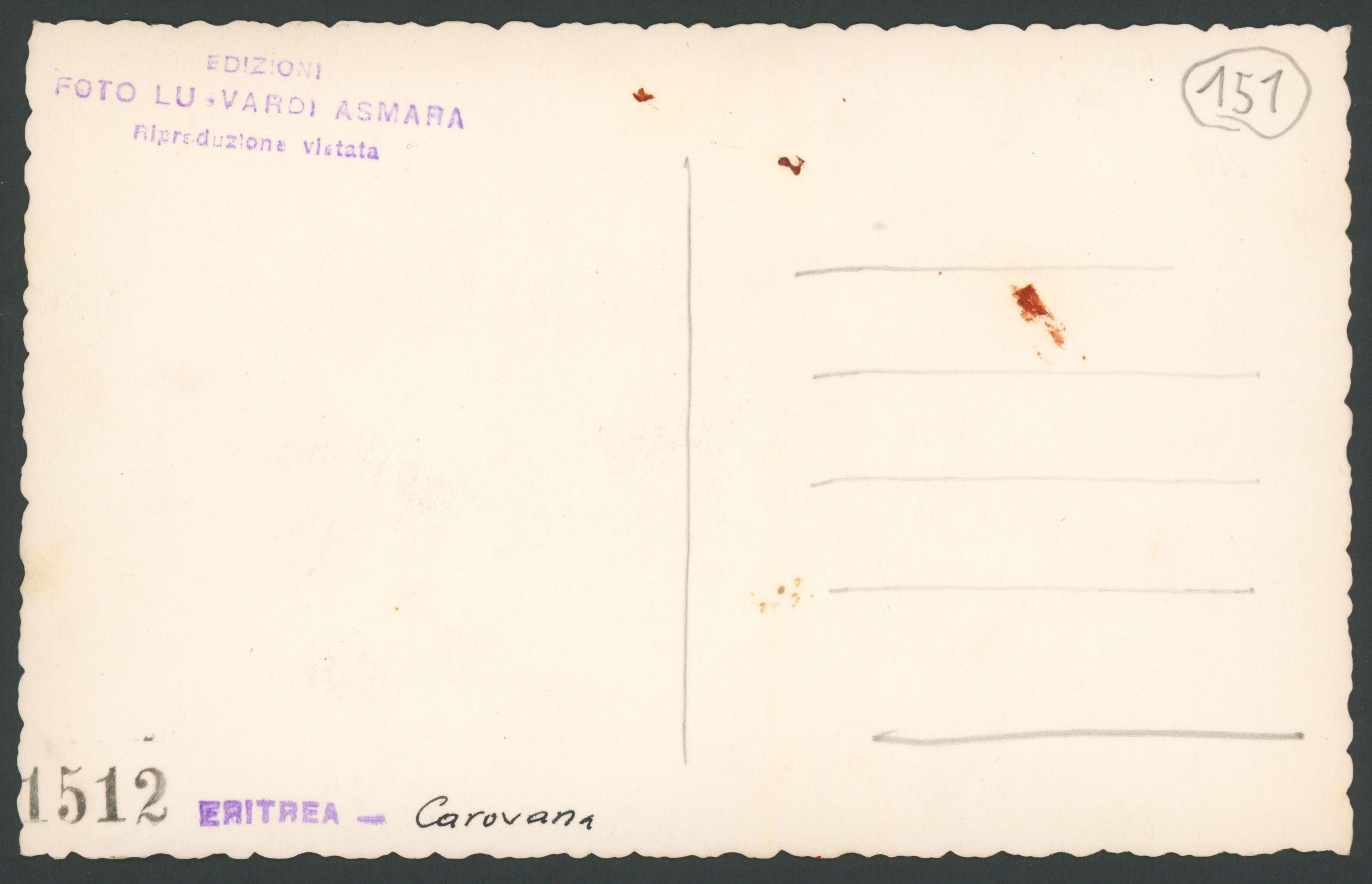 Timbri sul verso: Edizioni Foto Lusvardi Asmara Ripsoduzione [i.e. riproduzione] vietata; 1512; Eritrea