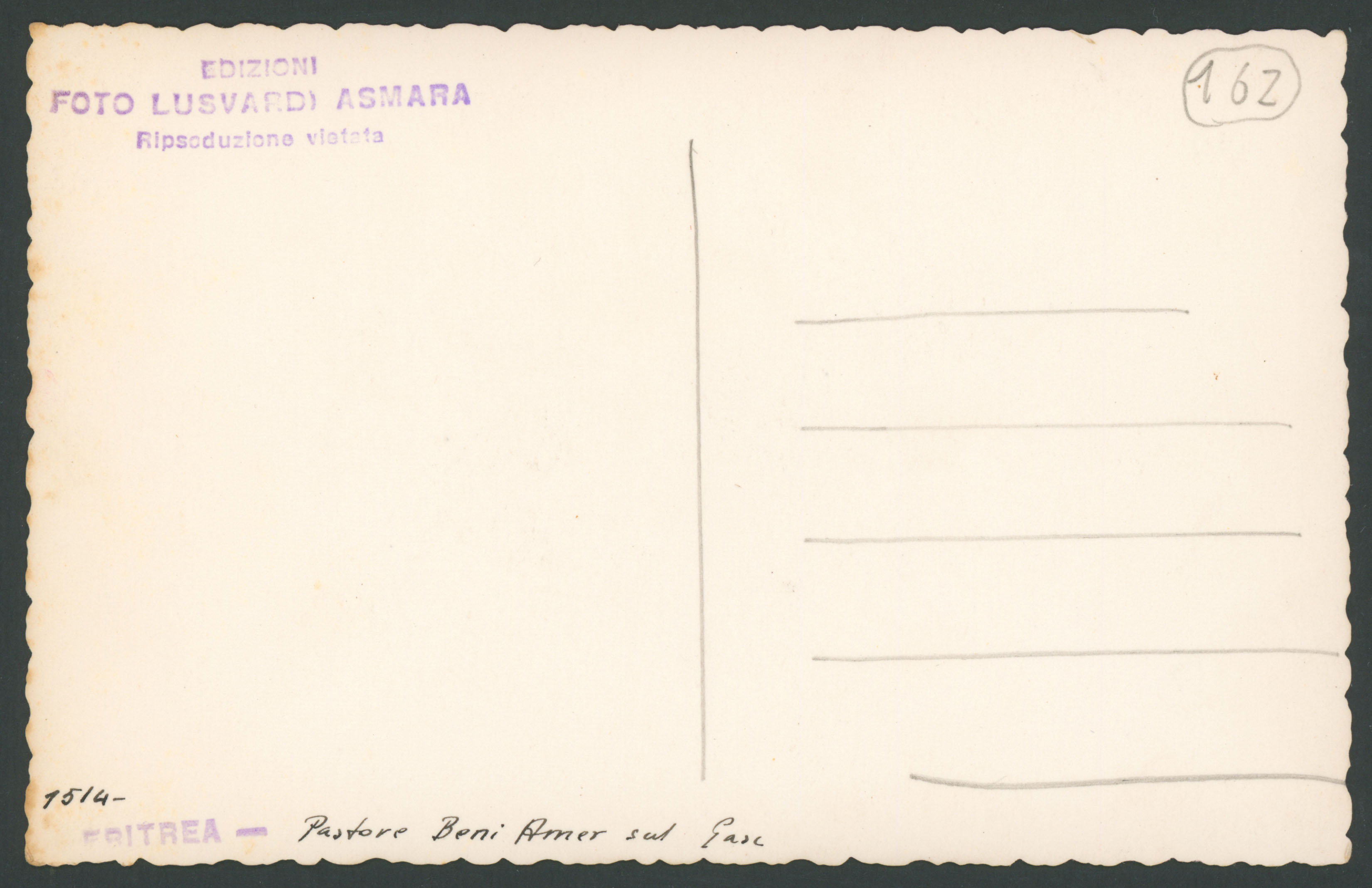 Timbri sul verso: Edizioni Foto Lusvardi Asmara Ripsoduzione [i.e. riproduzione] vietata; Eritrea