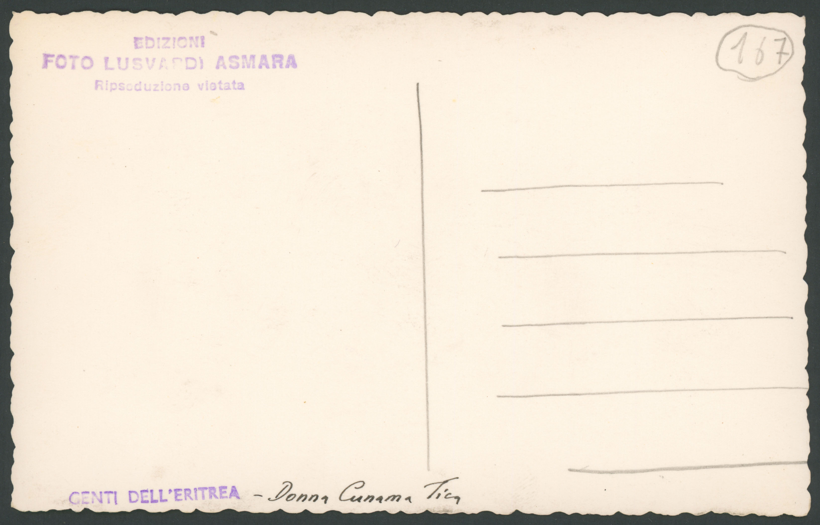Timbri sul verso: Edizioni Foto Lusvardi Asmara Ripsoduzione [i.e. riproduzione] vietata; Genti dell'Eritrea